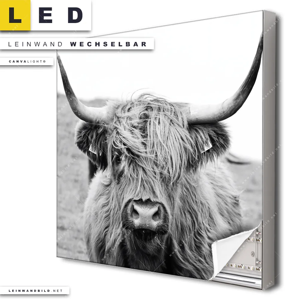 Dann sollte das LED Leinwandbild Canvalight® TEX | Rind im Hochland | Quadrat den Weg zu Dir finden. Das stufenlos dimmbare Leinwandbild Hochlandrind Grautöne im steckerfertigen Leuchtrahmen mit Fernbedienung und optionaler Farbtemperatursteuerung fügt sich als Eye-Catcher harmonisch in jedes Bar - Gastronomie, Wohnzimmer - Schlafzimmer Raumkonzept ein.