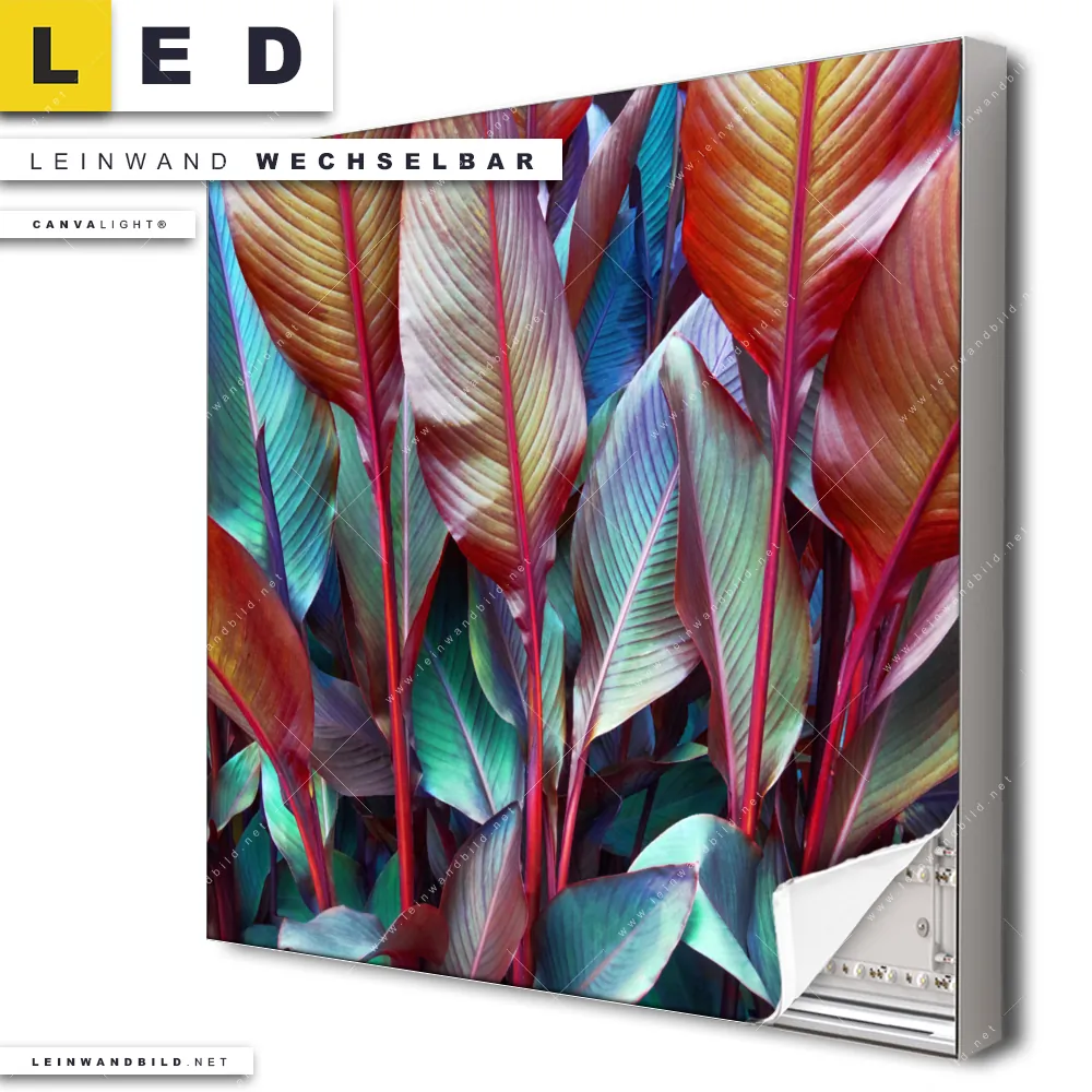 Du bist auf der Suche nach einem Muster - Texturen, Blumen - Botanik LED Leinwandbild im Quadratischen Format? Begriffe wie Blätter, Pflanze, Natur, Nahaufnahme, Blatt, Laub, Dschungel haben Dich auf der Suche nach Deinem neuen XXL LED Wandbild mit wechselbarer Leinwand inspiriert? Farben wie Rot, Grün, Mint, Orange dürfen auf Deinem neuen Leinwand-LED-Bild nicht fehlen und Leuchtbilder im Floral, Modern Art Stil passen perfekt zu Deinem Einrichtungsstil?