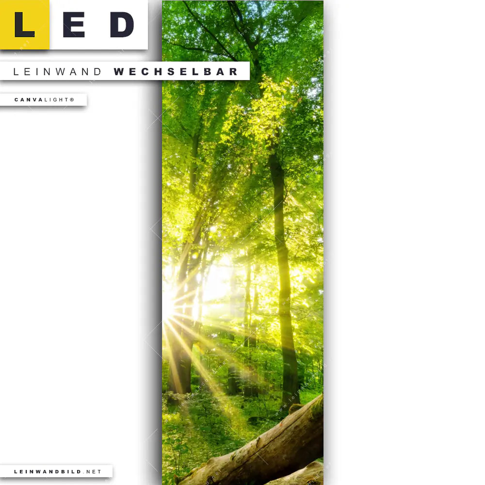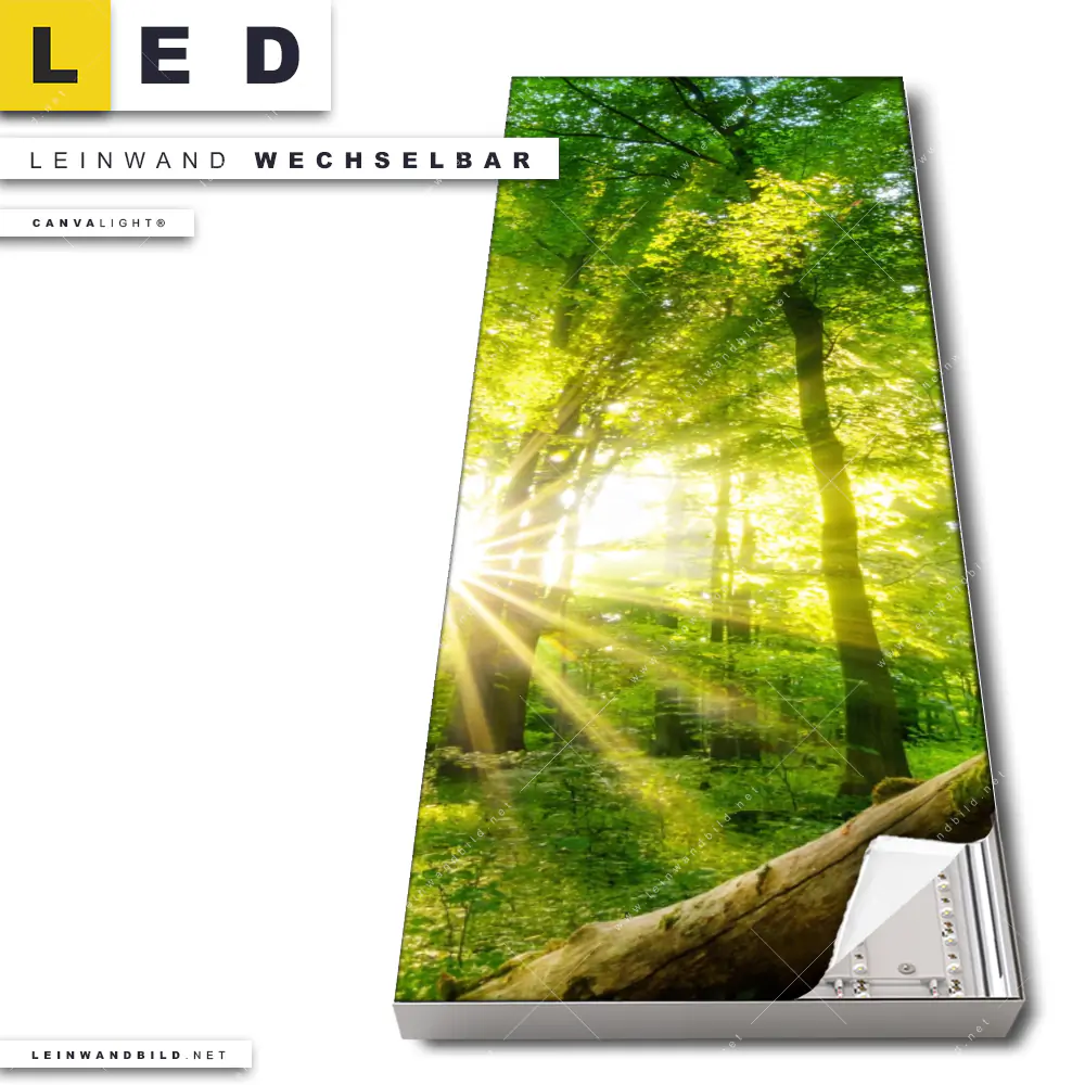 LED Leinwandbild Canvalight® TEX | Sonnenstrahlen im dichten Wald | Schmal