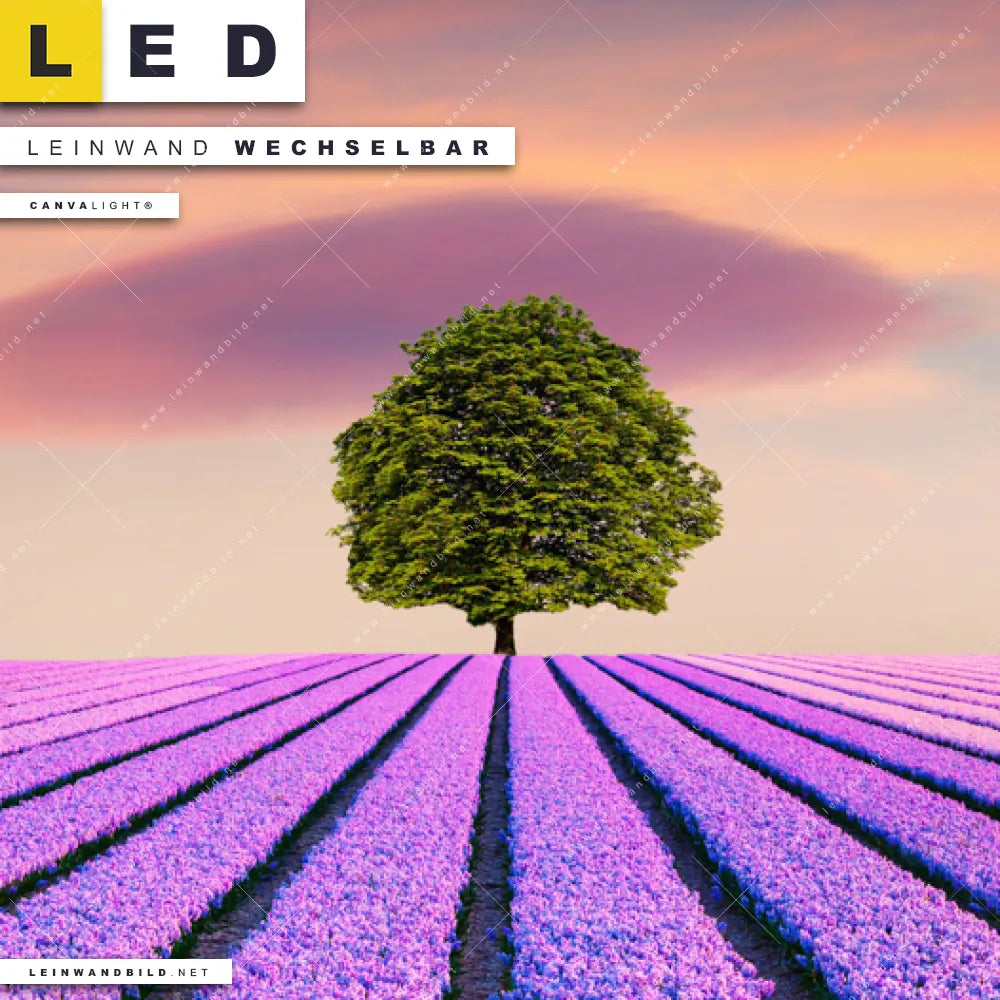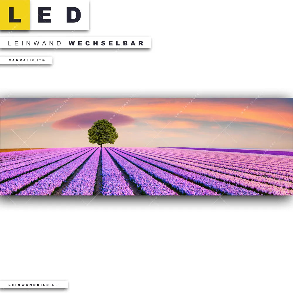 Du bist auf der Suche nach einem Landschaften LED Leinwandbild im Panorama-Format? Begriffe wie Blumen, Baum, Feld, Sonnenuntergang, Wiese, Himmel, Hyazinthenblumen, Hyazinthen haben Dich auf der Suche nach Deinem neuen XXL LED Wandbild mit wechselbarer Leinwand inspiriert? Farben wie Lila, Orange dürfen auf Deinem neuen extra breiten Leinwand-LED-Bild nicht fehlen und Leuchtbilder im Floral, Natürlich - Realistisch Stil passen perfekt zu Deinem Einrichtungsstil?