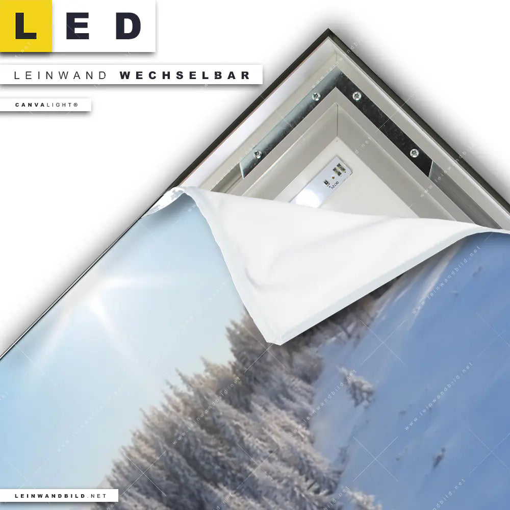 Du konfigurierst Dein individuelles LED Leinwandbild Canvalight® TEX | Berge und Wälder in Schnee | Panorama und wir produzieren es NEU für Dich. Unsere Landschaften, Winter LED Bilder mit wechselbarer Textil-Leinwand sind KEINE Lagerware. Du bist Dir unsicher, welches Motiv oder Format das richtige für dein individuelles Canvalight® Leuchtbild ist, dann helfen wir dir gerne weiter und beraten dich!