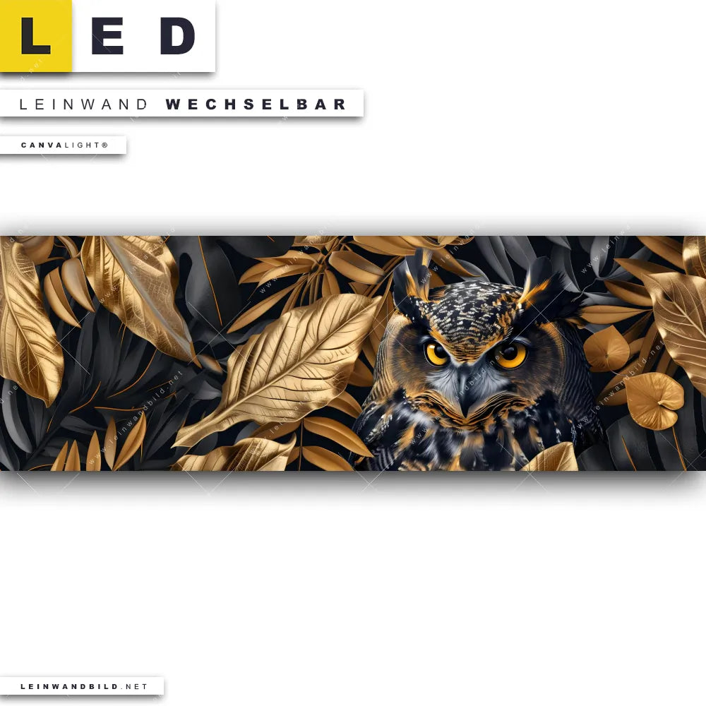 Du bist auf der Suche nach einem Tierwelt, Blumen - Botanik LED Leinwandbild im Panorama-Format? Begriffe wie Vogel, Blätter, Eule, Uhu, Kauz, Tier, Tierporträt haben Dich auf der Suche nach Deinem neuen XXL LED Wandbild mit wechselbarer Leinwand inspiriert? Farben wie Schwarz, Gold dürfen auf Deinem neuen extra breiten Leinwand-LED-Bild nicht fehlen und Leuchtbilder im Modern Art Stil passen perfekt zu Deinem Einrichtungsstil?