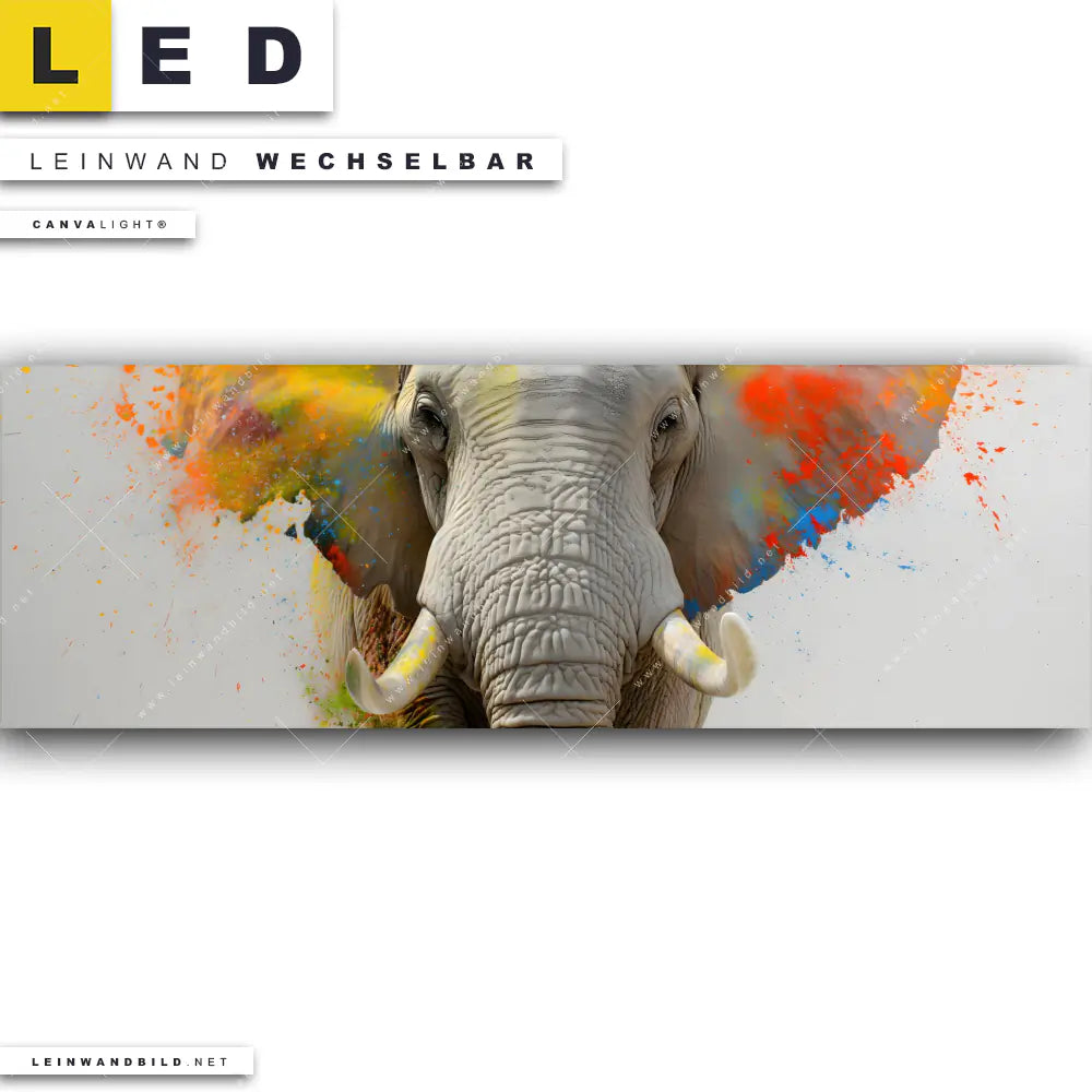 LED Leinwandbild Canvalight® TEX | Farbenexplosion mit Elefant | Panorama