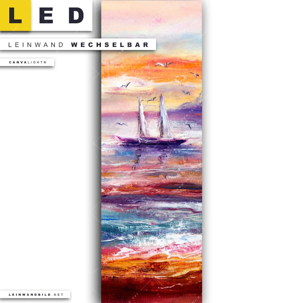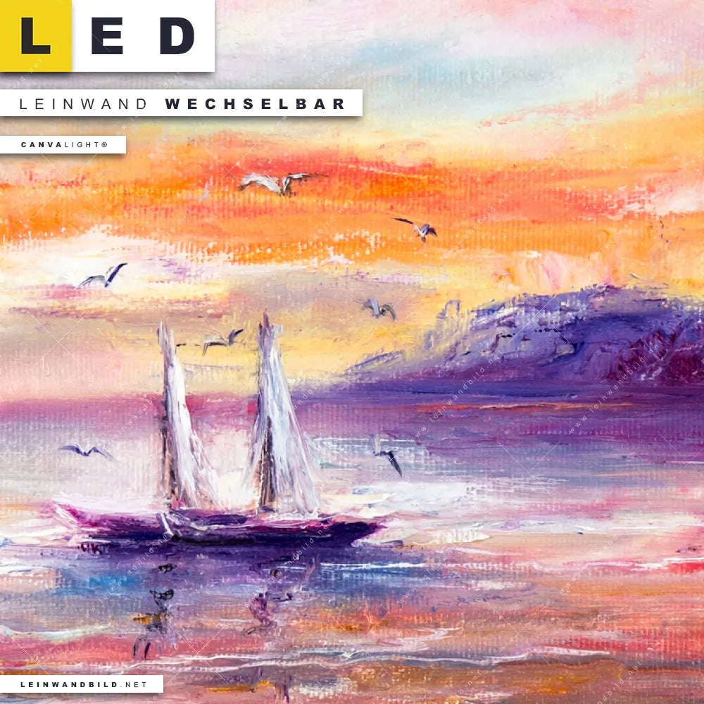 Begriffe wie Modern, Kunst, Gemälde, Ölfarbe, Meer, Boot, Sonnenuntergang, Sommer haben Dich auf der Suche nach Deinem neuen LED Wandbild mit beleuchteter Leinwand inspiriert? Dann sollte das LED Bild Farbenfrohes Meer mit Schiff mit austauschbarer Textil-Fotoleinwand den Weg zu Dir finden.