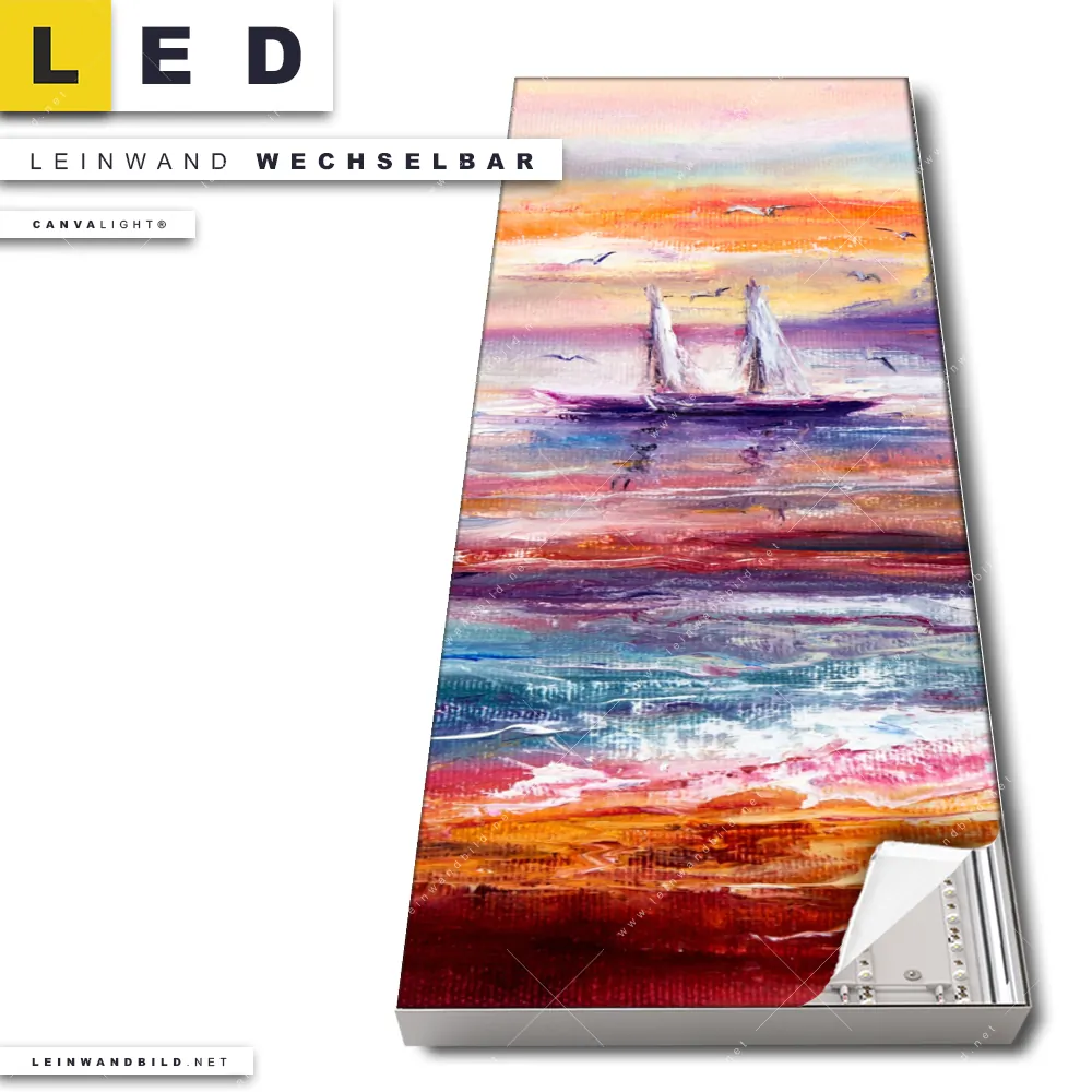 Du konfigurierst Dein individuelles LED Leinwandbild Canvalight® TEX | Gemälde mit Boot im Sonnenuntergang | Schmal und wir produzieren es NEU für Dich. Unsere Landschaften, Strand - Meer LED Bilder mit wechselbarer Textil-Leinwand sind KEINE Lagerware. Du bist Dir unsicher, welches Motiv oder Format das richtige für dein individuelles Canvalight® Leuchtbild ist, dann helfen wir dir gerne weiter und beraten dich!