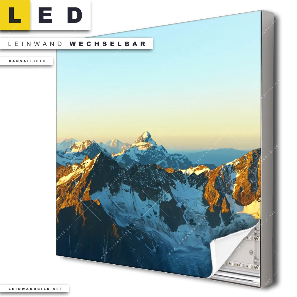 Du konfigurierst Dein individuelles LED Leinwandbild Canvalight® TEX | Gipfel in den Alpen | Quadrat und wir produzieren es NEU für Dich. Unsere Landschaften LED Bilder mit wechselbarer Textil-Leinwand sind KEINE Lagerware. Du bist Dir unsicher, welches Motiv oder Format das richtige für dein individuelles Canvalight® Leuchtbild ist, dann helfen wir dir gerne weiter und beraten dich!