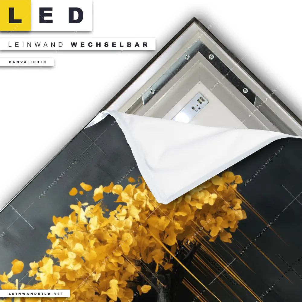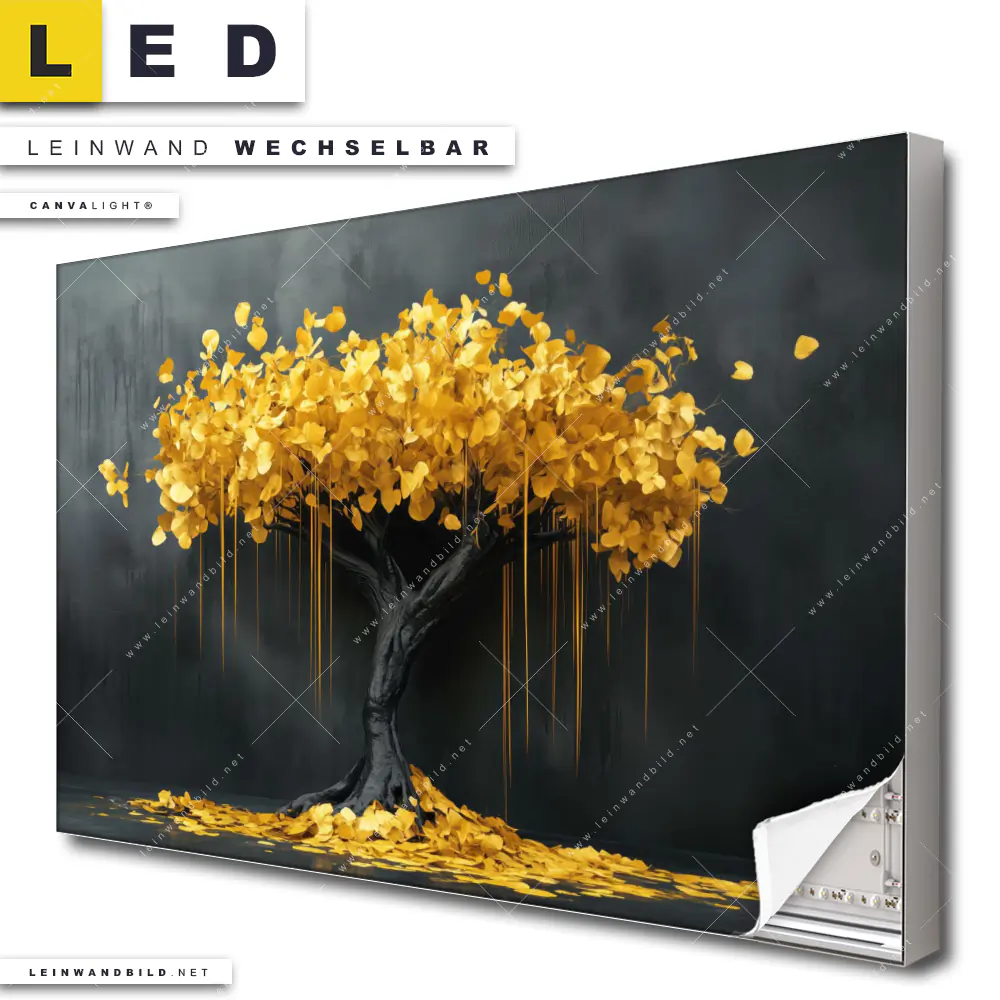 Du konfigurierst Dein individuelles LED Leinwandbild Canvalight® TEX | Goldener Lebensbaum | Querformat und wir produzieren es NEU für Dich. Unsere Wald - Bäume, Blumen - Botanik LED Bilder mit wechselbarer Textil-Leinwand sind KEINE Lagerware. Du bist Dir unsicher, welches Motiv oder Format das richtige für dein individuelles Canvalight® Leuchtbild ist, dann helfen wir dir gerne weiter und beraten dich!