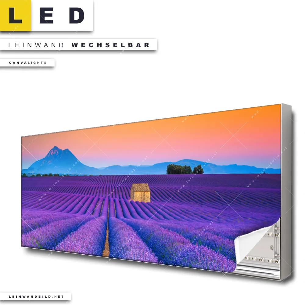 Du konfigurierst Dein individuelles LED Leinwandbild Canvalight® TEX | Lavendel Blumen Feld | Panorama und wir produzieren es NEU für Dich. Unsere Landschaften LED Bilder mit wechselbarer Textil-Leinwand sind KEINE Lagerware. Du bist Dir unsicher, welches Motiv oder Format das richtige für dein individuelles Canvalight® Leuchtbild ist, dann helfen wir dir gerne weiter und beraten dich!