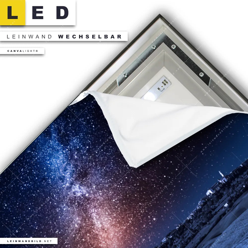 Du konfigurierst Dein individuelles LED Leinwandbild Canvalight® TEX | Milchstraße über einem Feldweg | Querformat und wir produzieren es NEU für Dich. Unsere Landschaften LED Bilder mit wechselbarer Textil-Leinwand sind KEINE Lagerware. Du bist Dir unsicher, welches Motiv oder Format das richtige für dein individuelles Canvalight® Leuchtbild ist, dann helfen wir dir gerne weiter und beraten dich!