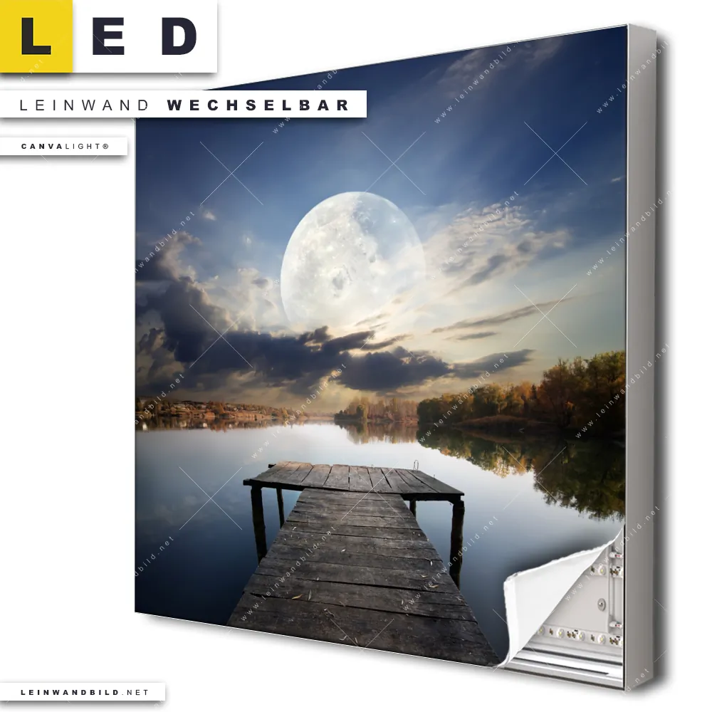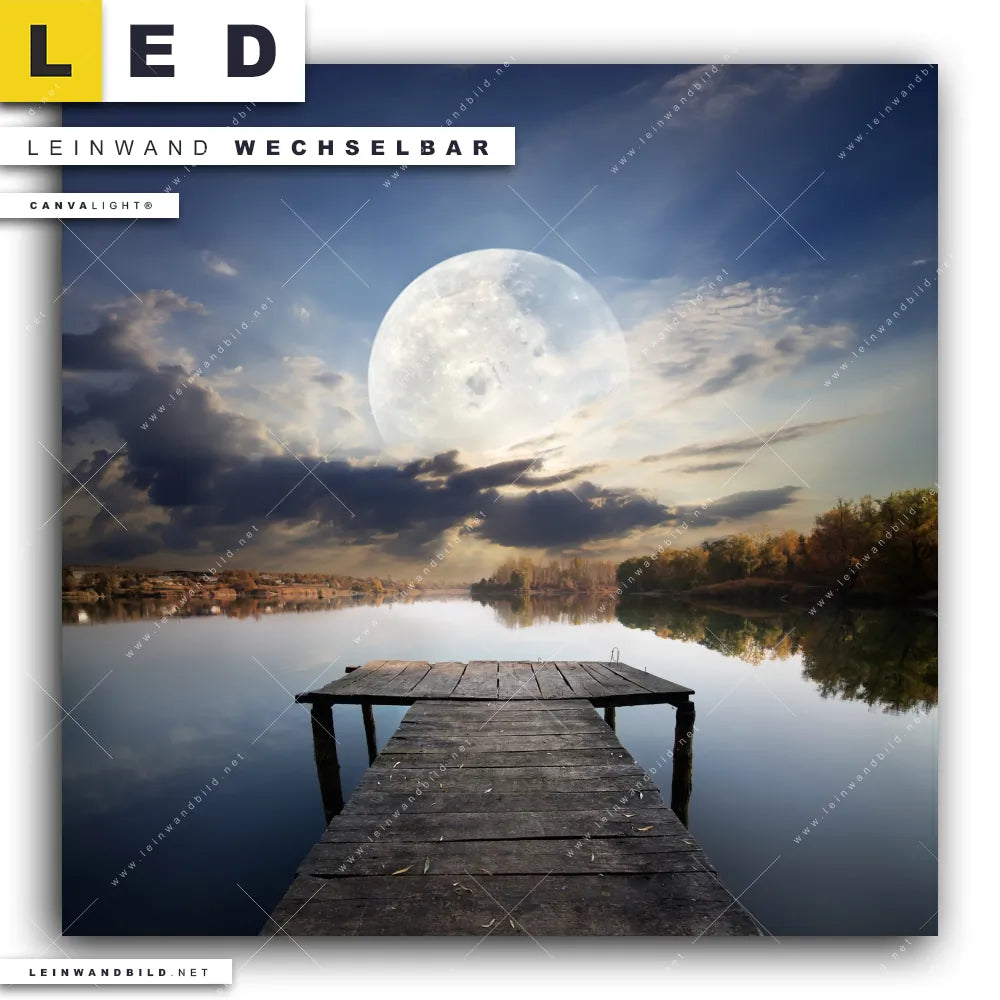 Dann sollte das LED Leinwandbild Canvalight® TEX | Pier am Fluss | Quadrat den Weg zu Dir finden. Das stufenlos dimmbare Leinwandbild Vollmond am See im steckerfertigen Leuchtrahmen mit Fernbedienung und optionaler Farbtemperatursteuerung fügt sich als Eye-Catcher harmonisch in jedes Arzt - Praxis, Wohnzimmer - Schlafzimmer, Flur - Eingangsbereich Raumkonzept ein.