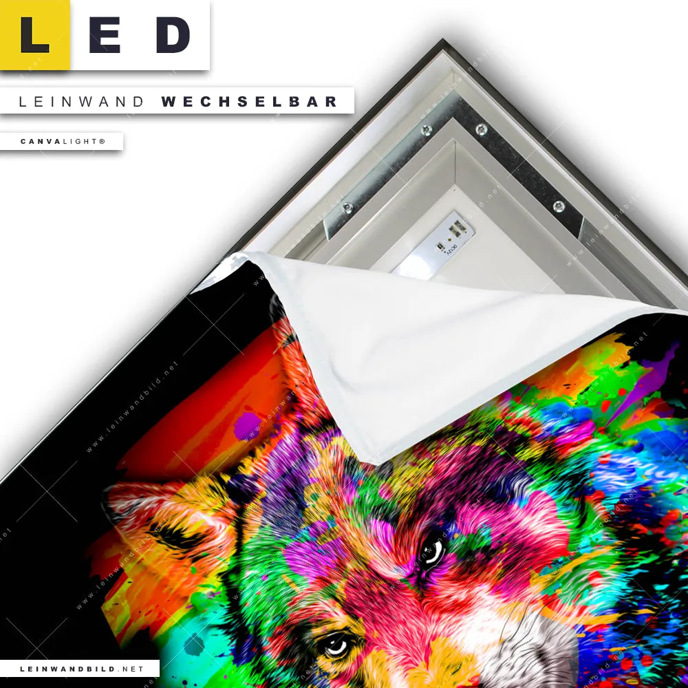 Du konfigurierst Dein individuelles LED Leinwandbild Canvalight® TEX | Pop Art Wolf | Quadrat und wir produzieren es NEU für Dich. Unsere Tierwelt LED Bilder mit wechselbarer Textil-Leinwand sind KEINE Lagerware. Du bist Dir unsicher, welches Motiv oder Format das richtige für dein individuelles Canvalight® Leuchtbild ist, dann helfen wir dir gerne weiter und beraten dich!