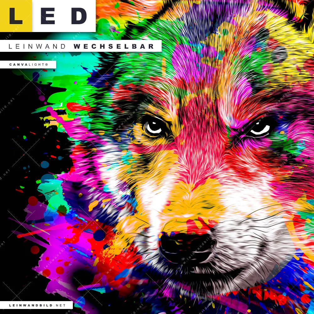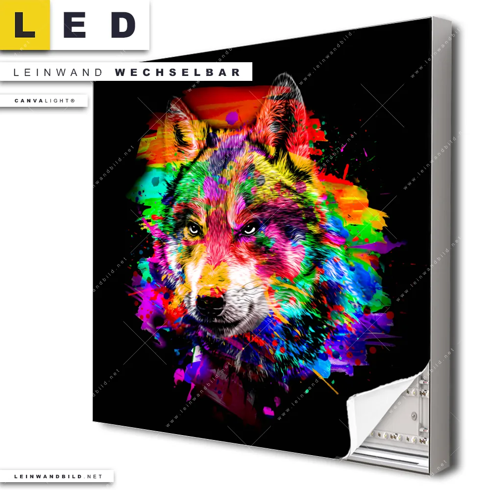 Du bist auf der Suche nach einem Tierwelt LED Leinwandbild im Quadratischen Format? Begriffe wie Wolf, Wald, Splash, Farbspritzer, Wölfin, Farbexplosion, Porträt haben Dich auf der Suche nach Deinem neuen XXL LED Wandbild mit wechselbarer Leinwand inspiriert? Farben wie Bunt, Schwarz dürfen auf Deinem neuen Leinwand-LED-Bild nicht fehlen und Leuchtbilder im Abstrakt, Modern Art, Pop Art Stil passen perfekt zu Deinem Einrichtungsstil?
