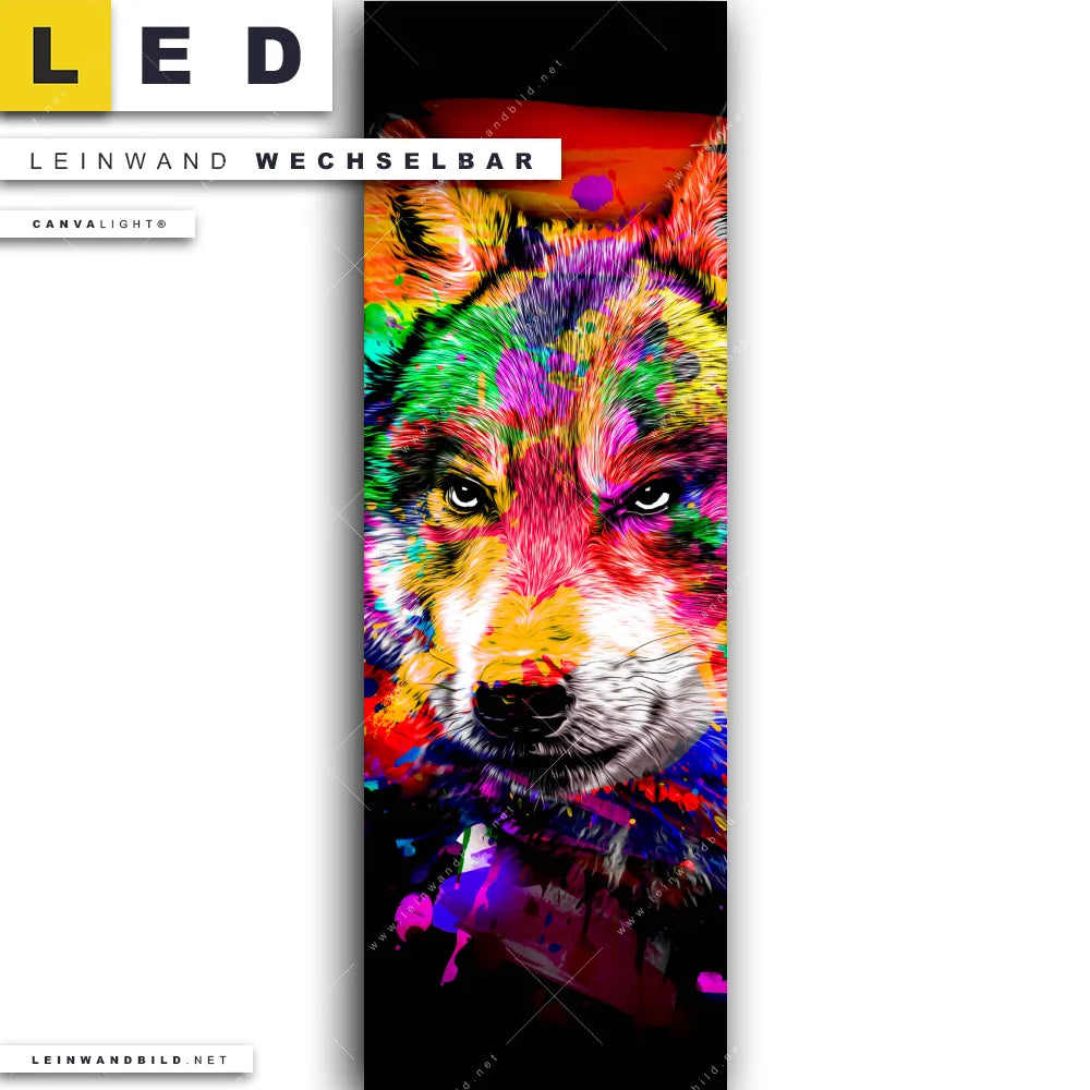Du bist auf der Suche nach einem Tierwelt LED Leinwandbild im Schmalen Format? Begriffe wie Wolf, Wald, Splash, Farbspritzer, Wölfin, Farbexplosion, Porträt haben Dich auf der Suche nach Deinem neuen XXL LED Wandbild mit wechselbarer Leinwand inspiriert? Farben wie Bunt, Schwarz dürfen auf Deinem neuen Leinwand-LED-Bild im Panorama-Hochformat nicht fehlen und Leuchtbilder im Abstrakt, Modern Art, Pop Art Stil passen perfekt zu Deinem Einrichtungsstil?