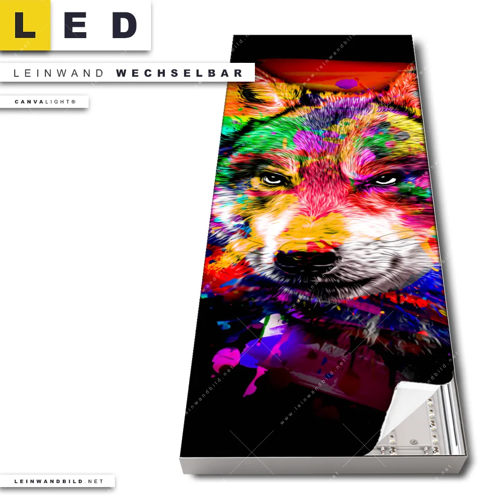 Du konfigurierst Dein individuelles LED Leinwandbild Canvalight® TEX | Pop Art Wolf | Schmal und wir produzieren es NEU für Dich. Unsere Tierwelt LED Bilder mit wechselbarer Textil-Leinwand sind KEINE Lagerware. Du bist Dir unsicher, welches Motiv oder Format das richtige für dein individuelles Canvalight® Leuchtbild ist, dann helfen wir dir gerne weiter und beraten dich!