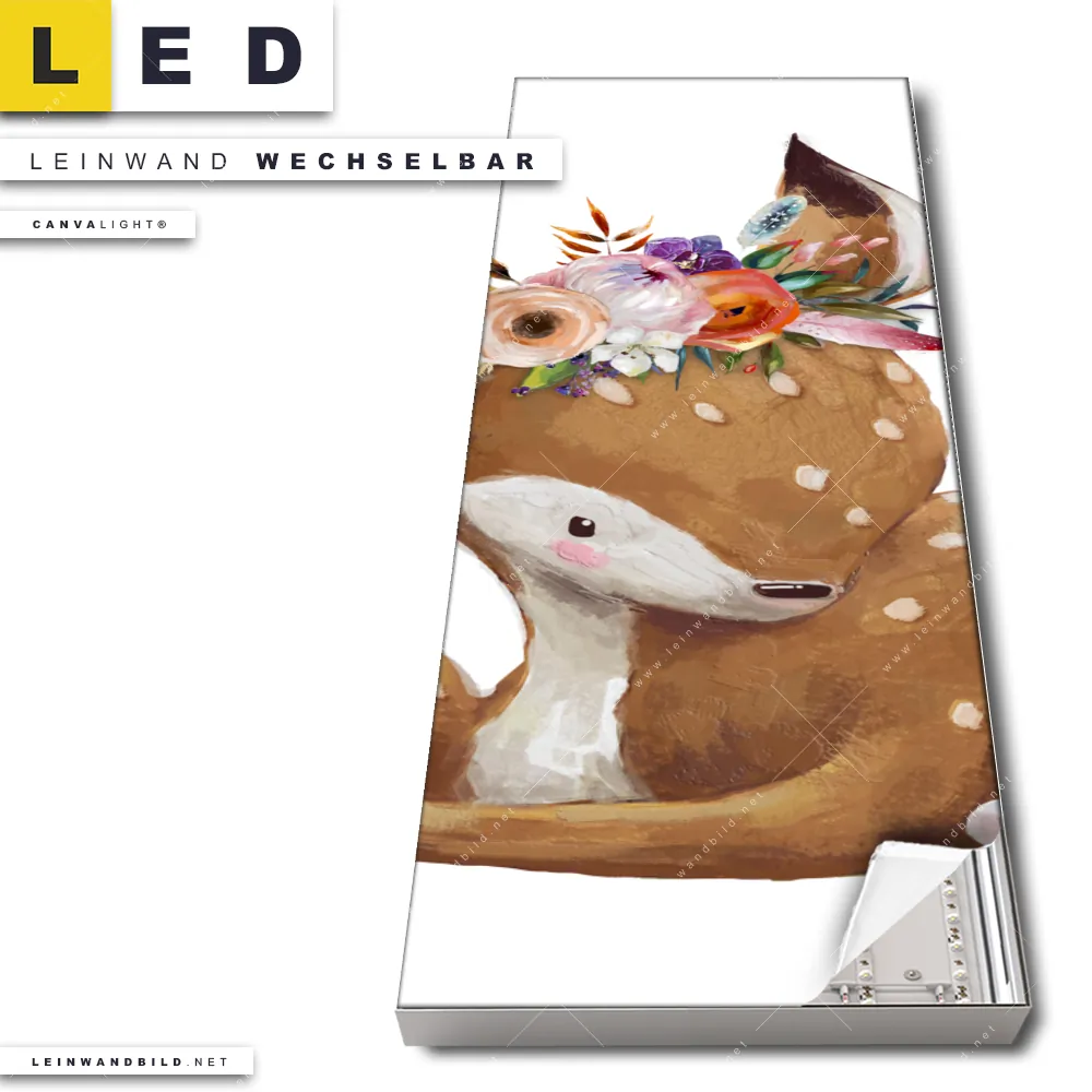 Du bist auf der Suche nach einem Tierwelt LED Leinwandbild im Schmalen Format? Begriffe wie Kinder, Reh, Hase, Tiere, Blumen, Aquarell, Kunst, Freunde haben Dich auf der Suche nach Deinem neuen XXL LED Wandbild mit wechselbarer Leinwand inspiriert? Farben wie Braun, Weiss, Grün, Rot, Lila, Rosa dürfen auf Deinem neuen Leinwand-LED-Bild im Panorama-Hochformat nicht fehlen und Leuchtbilder im Modern Art Stil passen perfekt zu Deinem Einrichtungsstil?