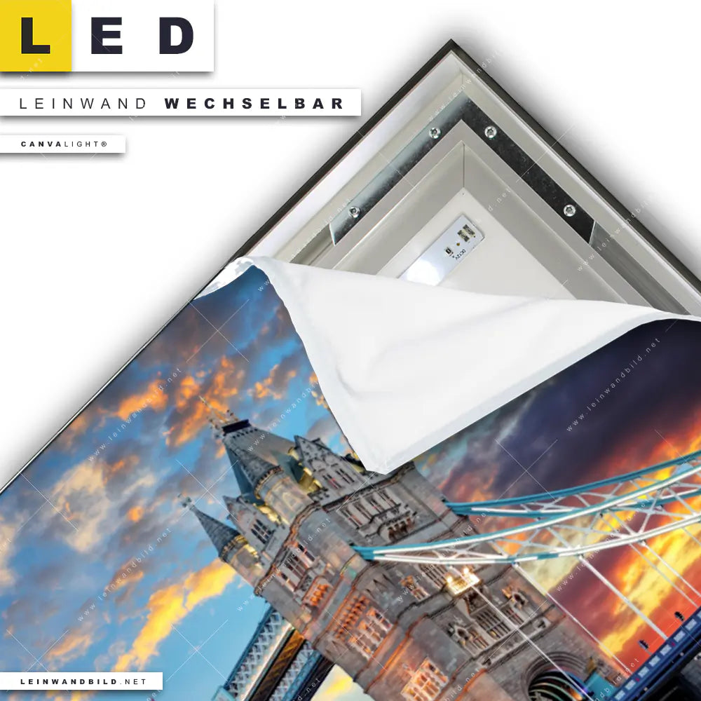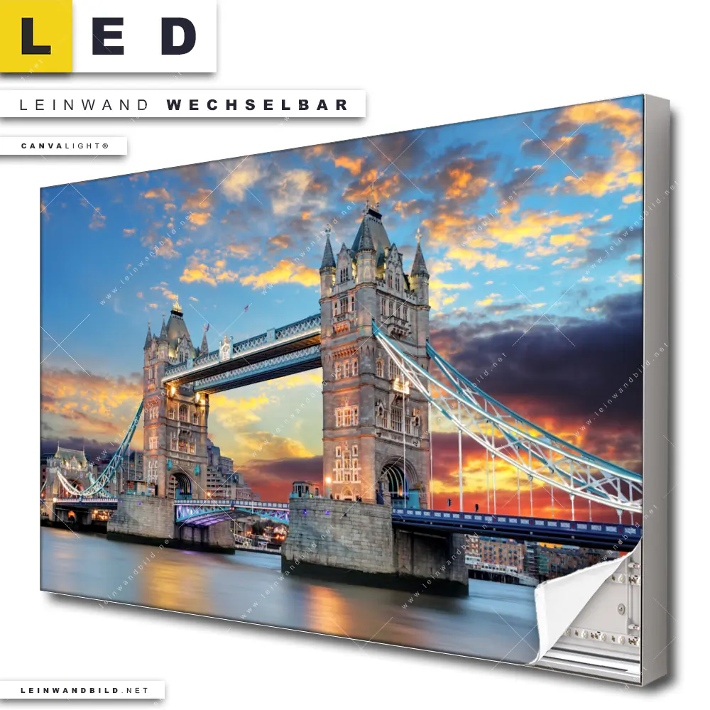 Du konfigurierst Dein individuelles LED Leinwandbild Canvalight® TEX | Tower Bridge im Abendglanz | Querformat und wir produzieren es NEU für Dich. Unsere Städte - Skylines LED Bilder mit wechselbarer Textil-Leinwand sind KEINE Lagerware. Du bist Dir unsicher, welches Motiv oder Format das richtige für dein individuelles Canvalight® Leuchtbild ist, dann helfen wir dir gerne weiter und beraten dich!