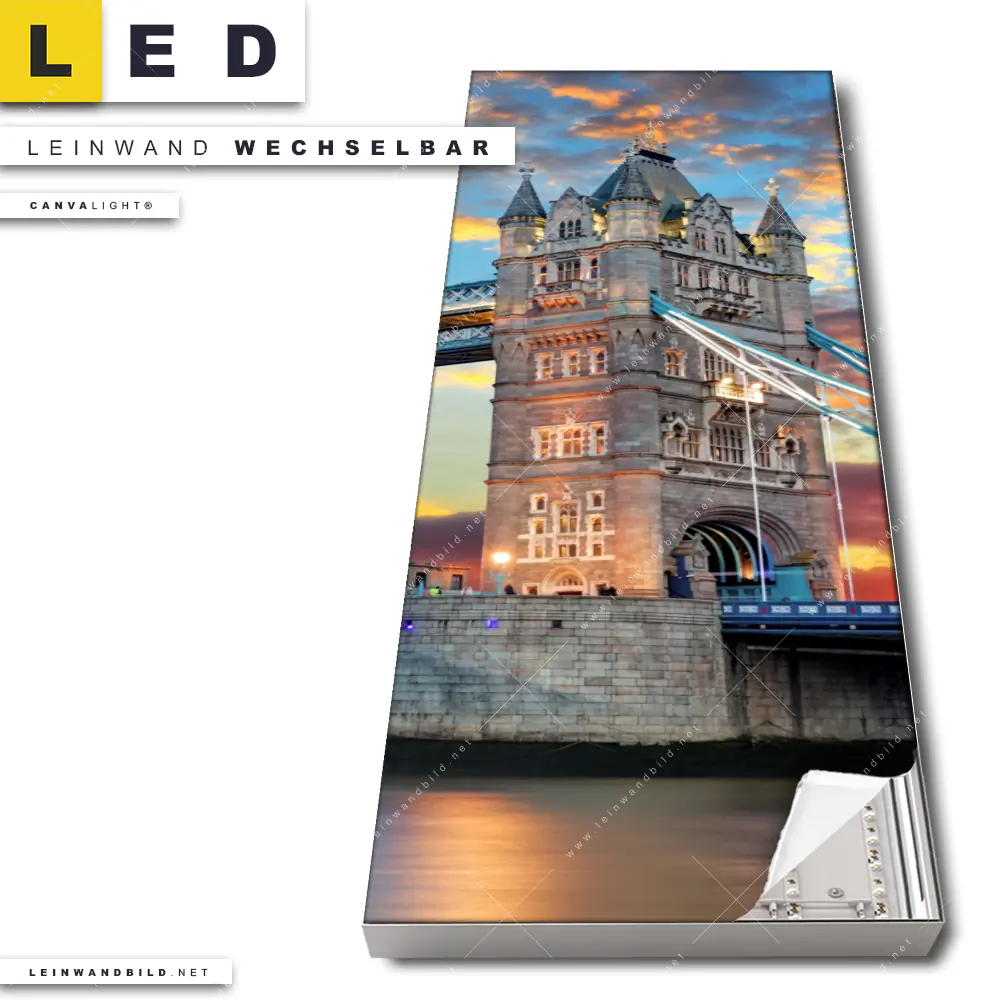 Du konfigurierst Dein individuelles LED Leinwandbild Canvalight® TEX | Tower Bridge im Abendglanz | Schmal und wir produzieren es NEU für Dich. Unsere Städte - Skylines LED Bilder mit wechselbarer Textil-Leinwand sind KEINE Lagerware. Du bist Dir unsicher, welches Motiv oder Format das richtige für dein individuelles Canvalight® Leuchtbild ist, dann helfen wir dir gerne weiter und beraten dich!