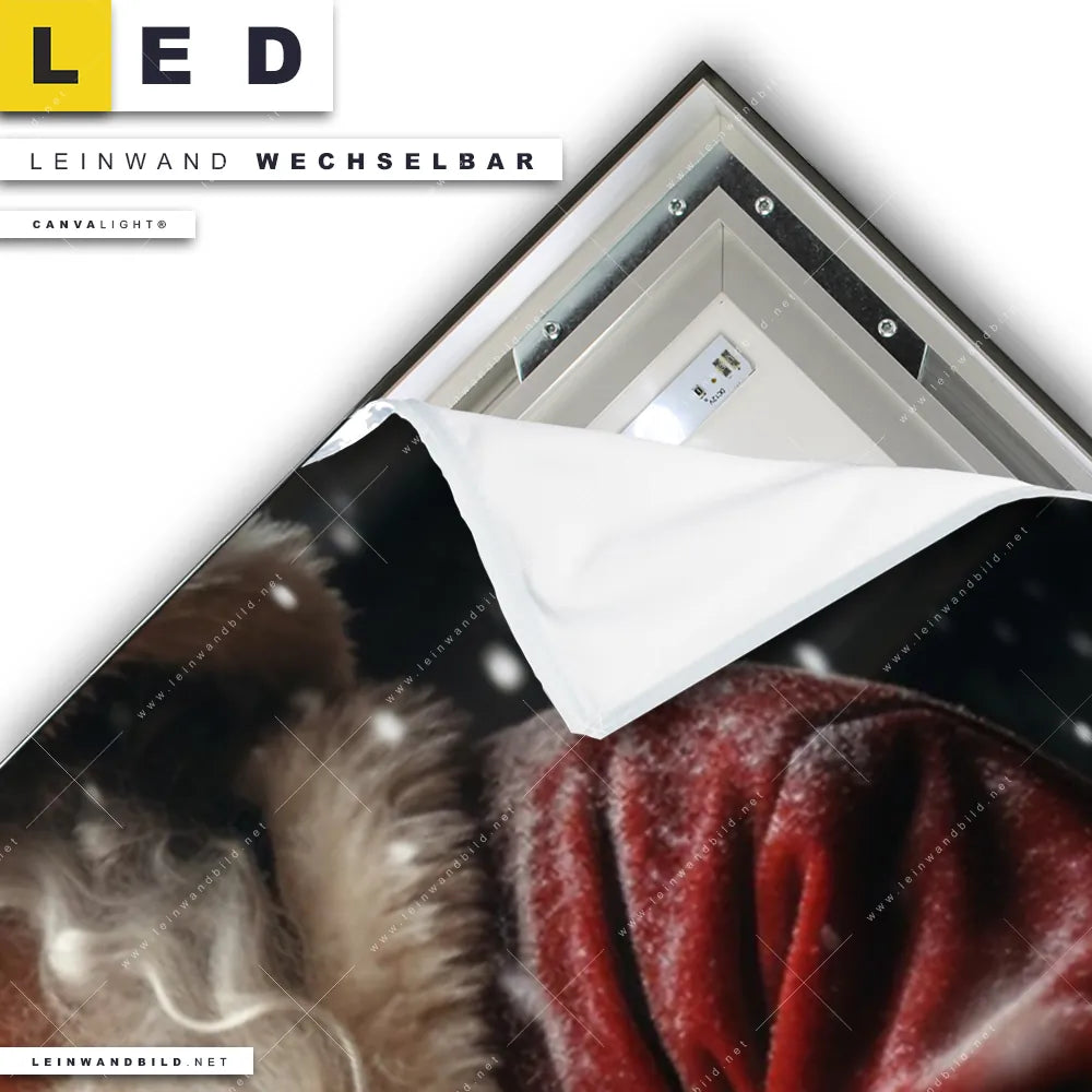 Du konfigurierst Dein individuelles LED Leinwandbild Canvalight® TEX | Weihnachtsmann füttert Rentier | Panorama und wir produzieren es NEU für Dich. Unsere Winter, Tierwelt LED Bilder mit wechselbarer Textil-Leinwand sind KEINE Lagerware. Du bist Dir unsicher, welches Motiv oder Format das richtige für dein individuelles Canvalight® Leuchtbild ist, dann helfen wir dir gerne weiter und beraten dich!