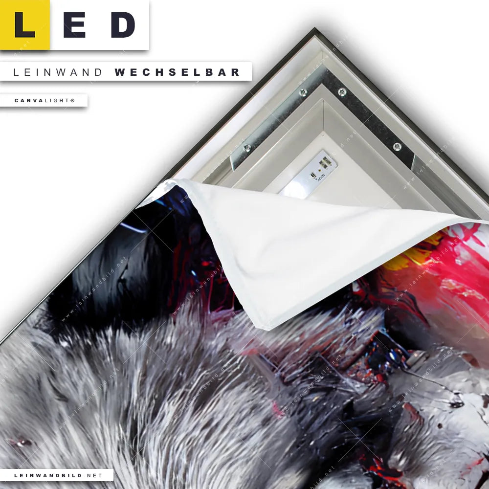 Du konfigurierst Dein individuelles LED Leinwandbild Canvalight® TEX | Wolf mit bunten Farbspritzern | Hochformat und wir produzieren es NEU für Dich. Unsere Tierwelt LED Bilder mit wechselbarer Textil-Leinwand sind KEINE Lagerware. Du bist Dir unsicher, welches Motiv oder Format das richtige für dein individuelles Canvalight® Leuchtbild ist, dann helfen wir dir gerne weiter und beraten dich!