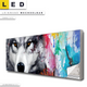 Dann sollte das LED Leinwandbild Canvalight® TEX | Wolf mit bunten Farbspritzern | Hochformat den Weg zu Dir finden. Das stufenlos dimmbare Leinwandbild bunte Farben um grauen Wolf im steckerfertigen Leuchtrahmen mit Fernbedienung und optionaler Farbtemperatursteuerung fügt sich als Eye-Catcher harmonisch in jedes Bar - Gastronomie, Wohnzimmer - Schlafzimmer, Büro - Kanzlei, Flur - Eingangsbereich Raumkonzept ein.