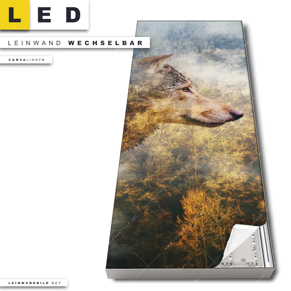 Dann sollte das LED Leinwandbild Canvalight® TEX | Wolf & Wald No.2 | Schmal den Weg zu Dir finden. Das stufenlos dimmbare Leinwandbild Wolf mit durchscheinendem Wald im steckerfertigen Leuchtrahmen mit Fernbedienung und optionaler Farbtemperatursteuerung fügt sich als Eye-Catcher harmonisch in jedes Wohnzimmer - Schlafzimmer, Büro - Kanzlei Raumkonzept ein.
