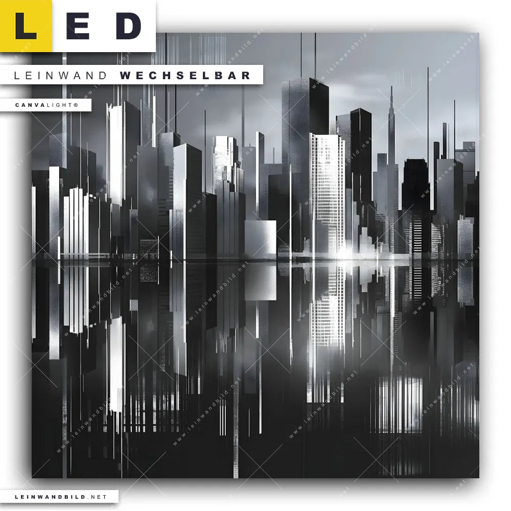 Du bist auf der Suche nach einem Städte - Skylines LED Leinwandbild im Quadratischen Format? Begriffe wie Skyline, Metropole, Häuser, Wolkenkratzer, Hochhäuser, Stadt, Gebäude, Kunst, Malerei haben Dich auf der Suche nach Deinem neuen XXL LED Wandbild mit wechselbarer Leinwand inspiriert? Farben wie Schwarz, Weiss, Silber dürfen auf Deinem neuen Leinwand-LED-Bild nicht fehlen und Leuchtbilder im Modern Art, Abstrakt, Schwarz - Weiss Stil passen perfekt zu Deinem Einrichtungsstil?