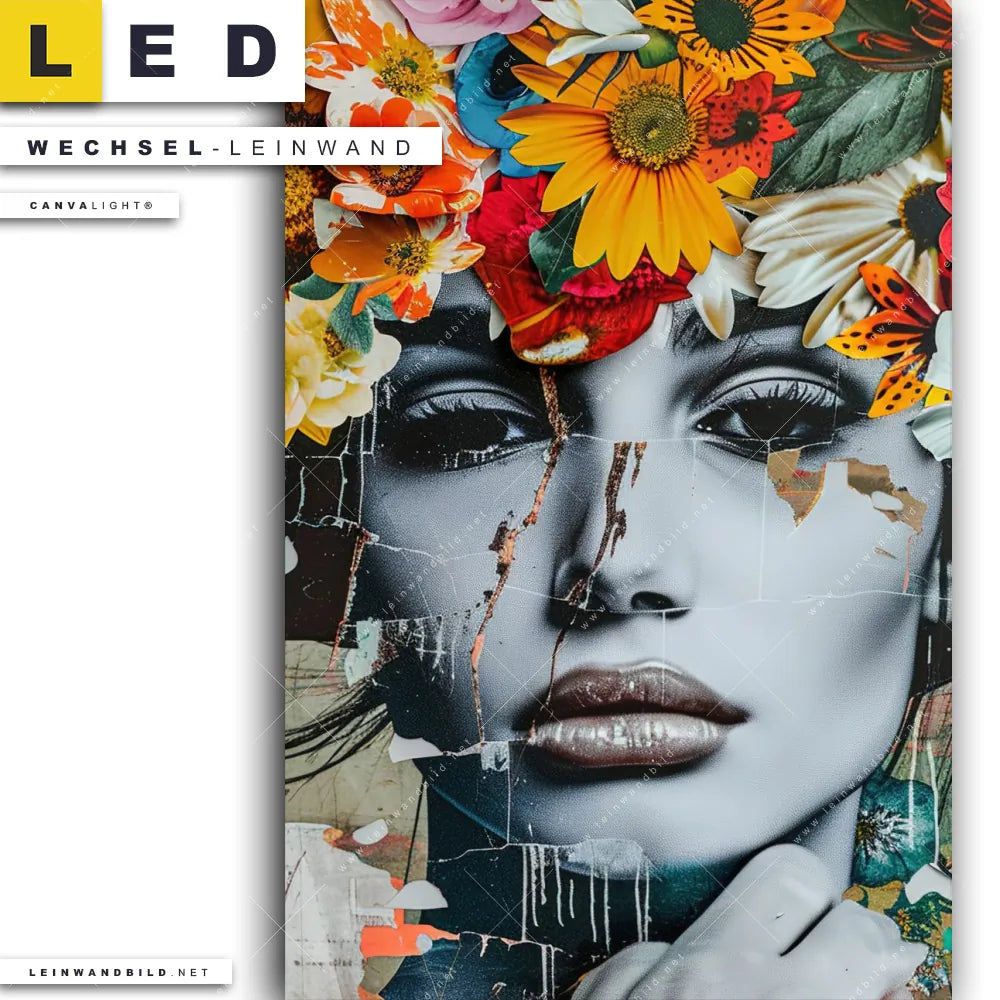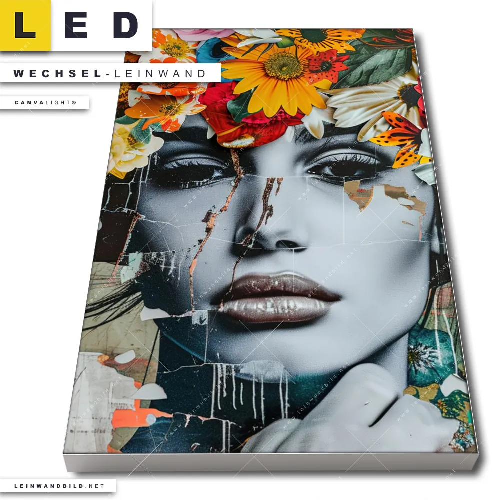 Auf der Suche nach Deinem neuen Wechselmotiv für LED Bilder mit austauschbarer Textil-Leinwand haben Dich Begriffe wie Blumen, Gesicht, Haare, Augen, Lippen, Blüten inspiriert? Dann sollte die Wechsel-Leinwand Abstraktes Frauengesicht für Canvalight® TEX LED Leuchtbilder den Weg zu Dir finden.