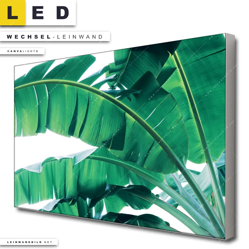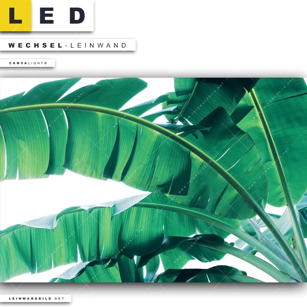 Du konfigurierst Deine individuelle LED Wechsel-Leinwand Canvalight® TEX | Bananenpalme | Querformat und wir produzieren sie NEU für Dich. Unsere Blumen - Botanik Austausch-Fotoleinwände für Canvalight® LED Bilder sind KEINE Lagerware. Du bist Dir unsicher, welches Motiv oder Format das richtige für dein individuelles LED Wechselmotiv auf Leinwand ist, dann helfen wir dir gerne weiter und beraten dich!