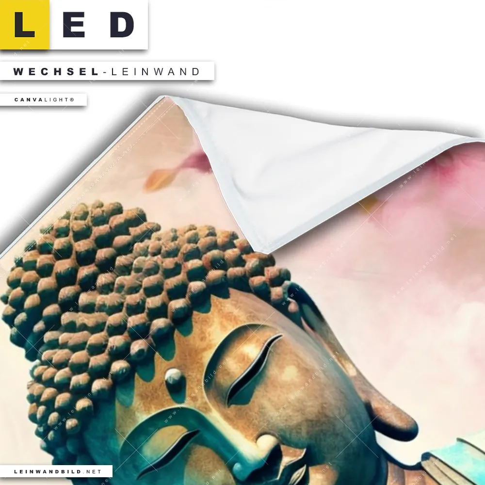 LED Wechsel-Leinwand Canvalight® TEX | Buddha Statue mit Kirschblüten | Hochformat