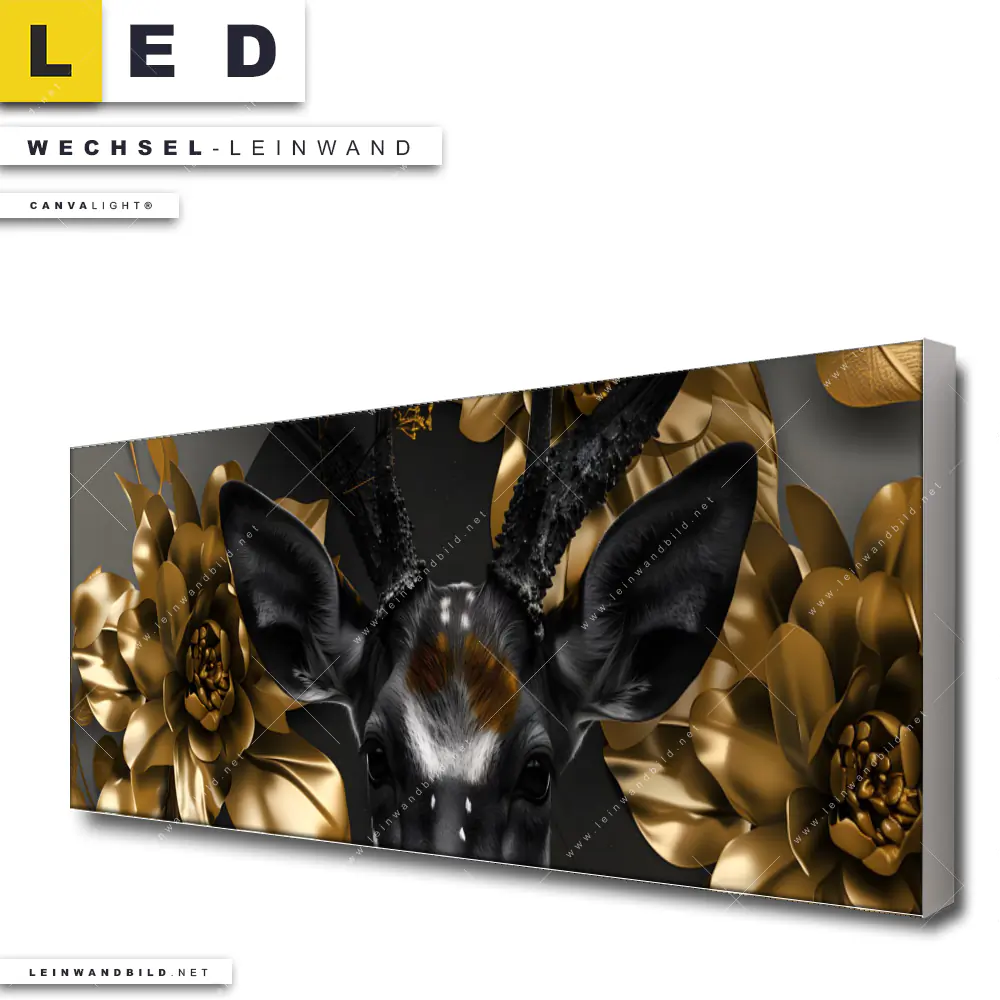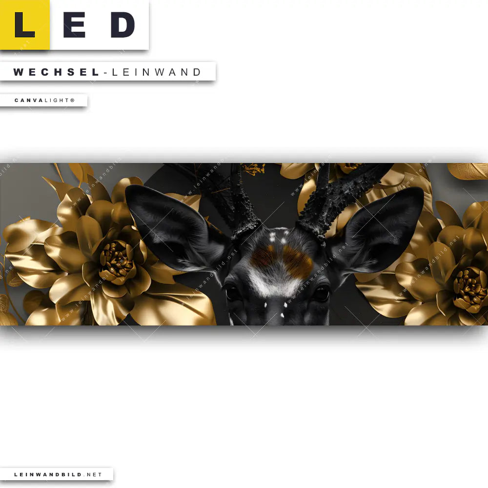 LED Wechsel-Leinwand Canvalight® TEX | Junger Hirsch und Goldblumen | Panorama