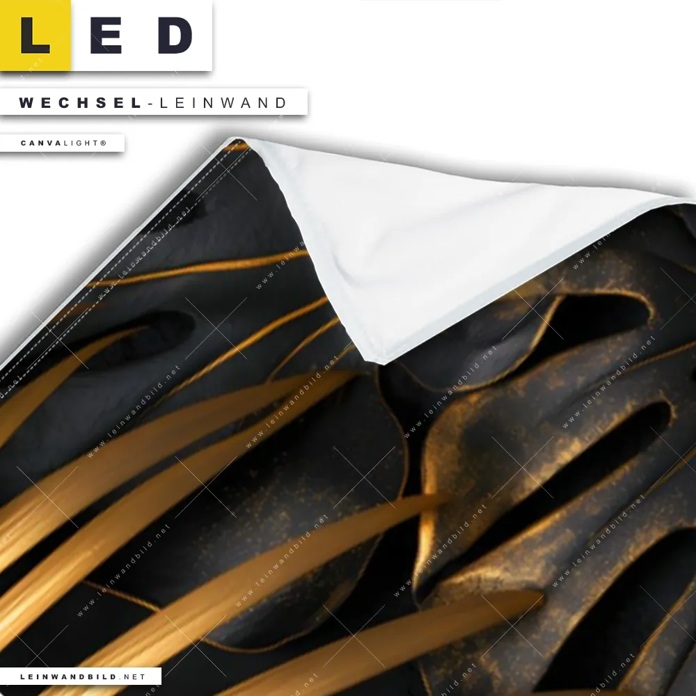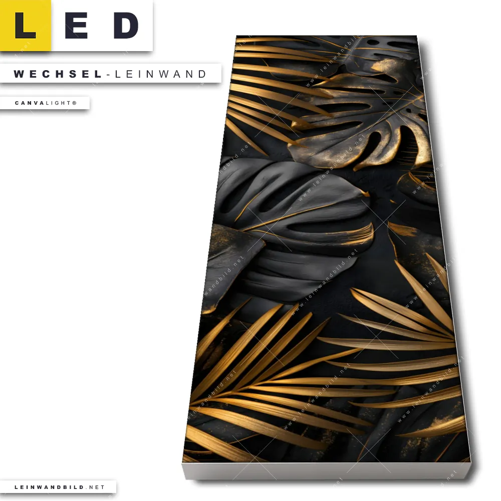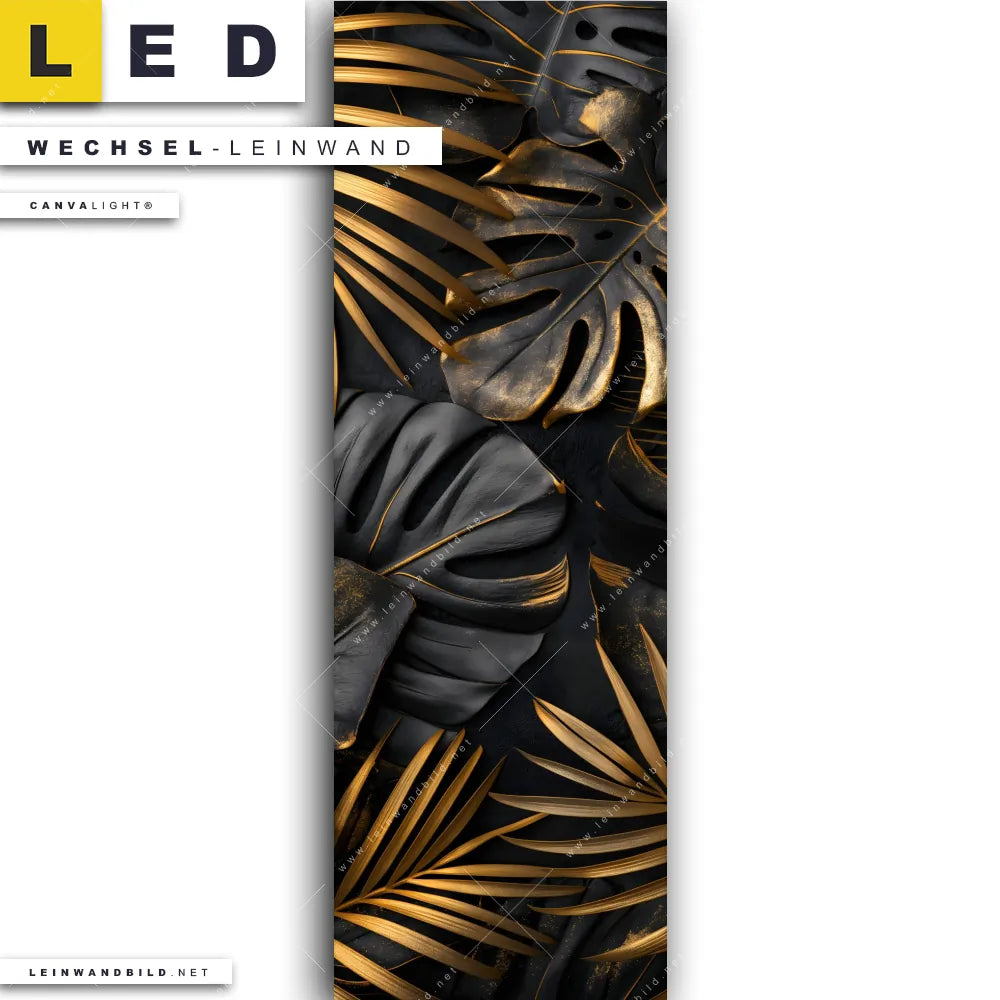 Du bist auf der Suche nach einer Muster - Texturen, Blumen - Botanik Wechsel-Leinwand für Dein LED-Leinwandbild im Schmalen Format? Begriffe wie Blätter, Pflanze, Natur, Nahaufnahme, Laub, Dschungel, Monstera, Palmenblätter haben Dich auf der Suche nach Deiner Ersatz-Leinwand für dein LED Wandbild im Panorama-Hochformat mit wechselbarer Leinwand inspiriert? Farben wie Schwarz, Gold dürfen auf Deinem neuen Wechselmotiv für Dein XXL Leinwand-LED-Bild nicht fehlen und Leinwände im Floral, Modern Art Stil für Leuchtbilder passen perfekt zu Deinem Einrichtungsstil?