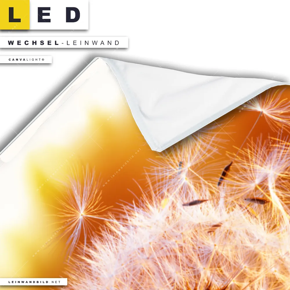 Du konfigurierst Deine individuelle LED Wechsel-Leinwand Canvalight® TEX | Pusteblume No. 8 | Hochformat und wir produzieren sie NEU für Dich. Unsere Blumen - Botanik Austausch-Fotoleinwände für Canvalight® LED Bilder sind KEINE Lagerware. Du bist Dir unsicher, welches Motiv oder Format das richtige für dein individuelles LED Wechselmotiv auf Leinwand ist, dann helfen wir dir gerne weiter und beraten dich!