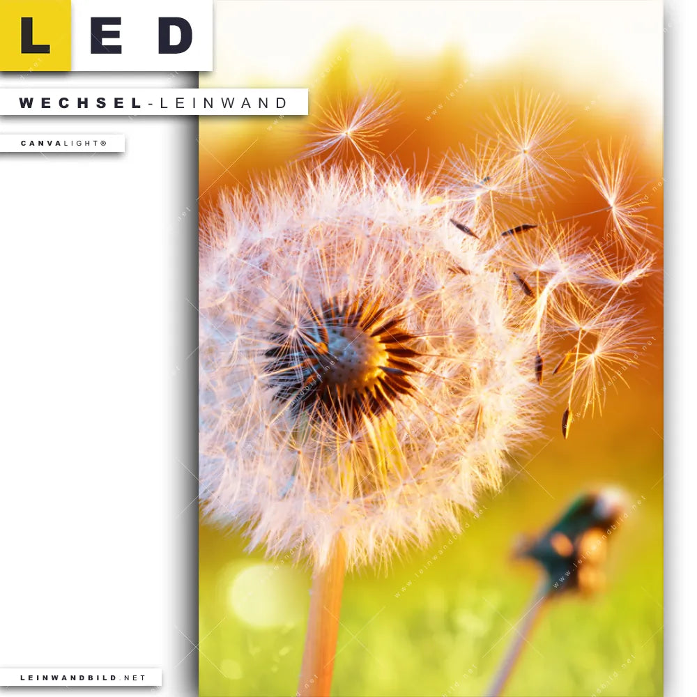 Du bist auf der Suche nach einer Blumen - Botanik Wechsel-Leinwand für Dein LED-Leinwandbild im Hochformat? Begriffe wie Blume, Botanik, Pflanze, Natur, Nahaufnahme, Pusteblume, Dandelion, Löwenzahn haben Dich auf der Suche nach Deiner Ersatz-Leinwand für dein LED Wandbild mit wechselbarer Leinwand inspiriert? Farben wie Orange, Hellgrün dürfen auf Deinem neuen Wechselmotiv für Dein XXL Leinwand-LED-Bild nicht fehlen und Leinwände im Floral, Natürlich - Realistisch Stil für Leuchtbilder passen perfekt zu Deinem Einrichtungsstil?