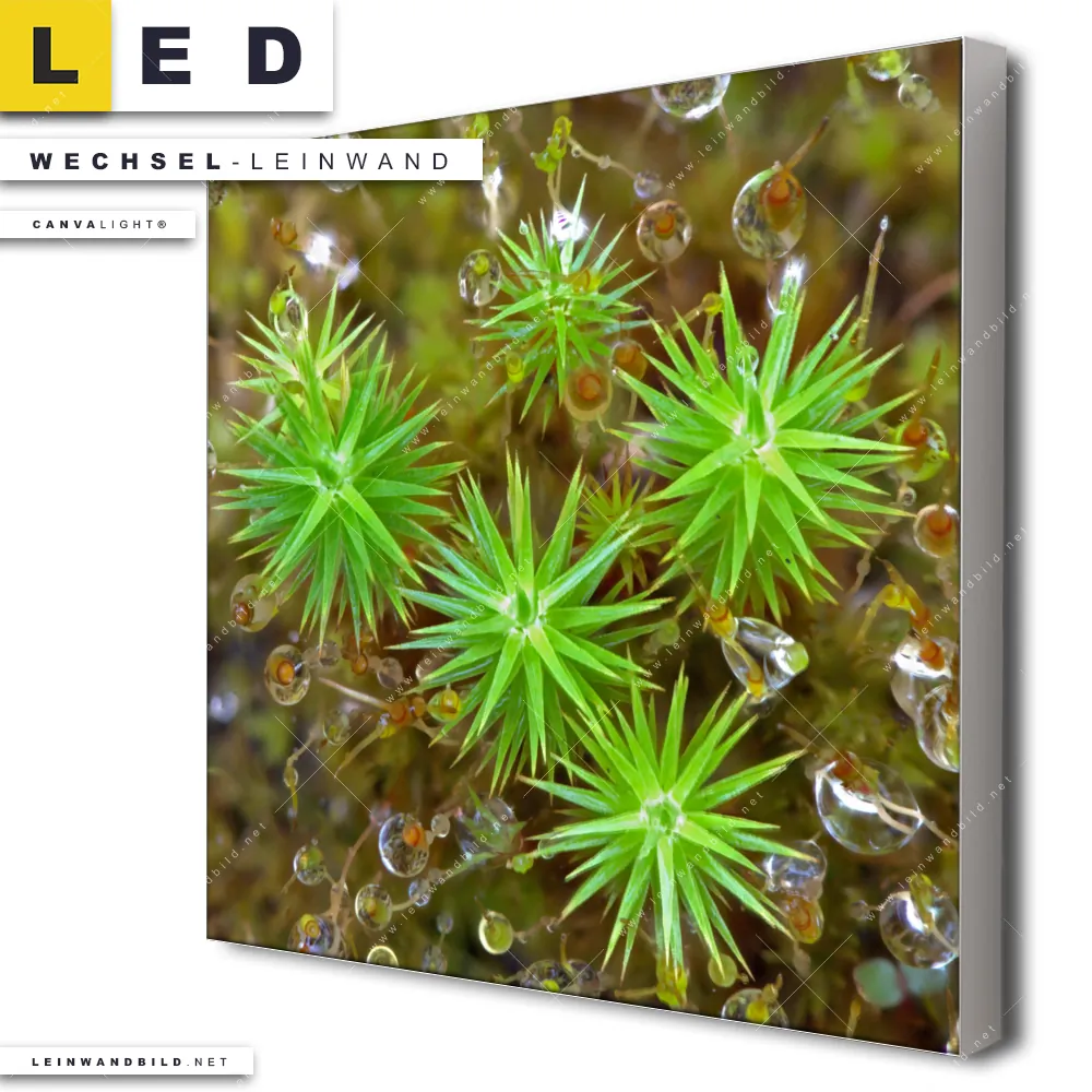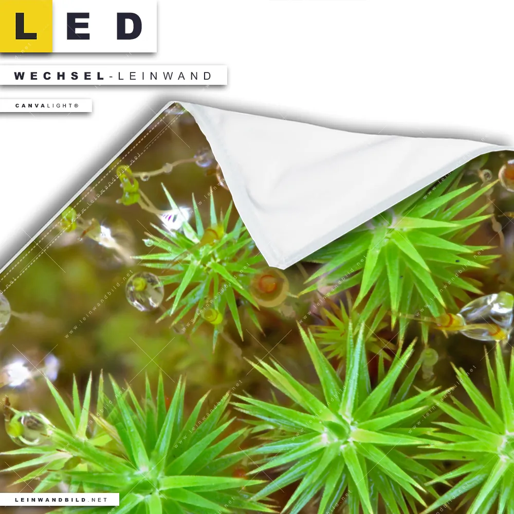Du konfigurierst Deine individuelle LED Wechsel-Leinwand Canvalight® TEX | Tautropfen auf Moos | Quadrat und wir produzieren sie NEU für Dich. Unsere Blumen - Botanik Austausch-Fotoleinwände für Canvalight® LED Bilder sind KEINE Lagerware. Du bist Dir unsicher, welches Motiv oder Format das richtige für dein individuelles LED Wechselmotiv auf Leinwand ist, dann helfen wir dir gerne weiter und beraten dich!