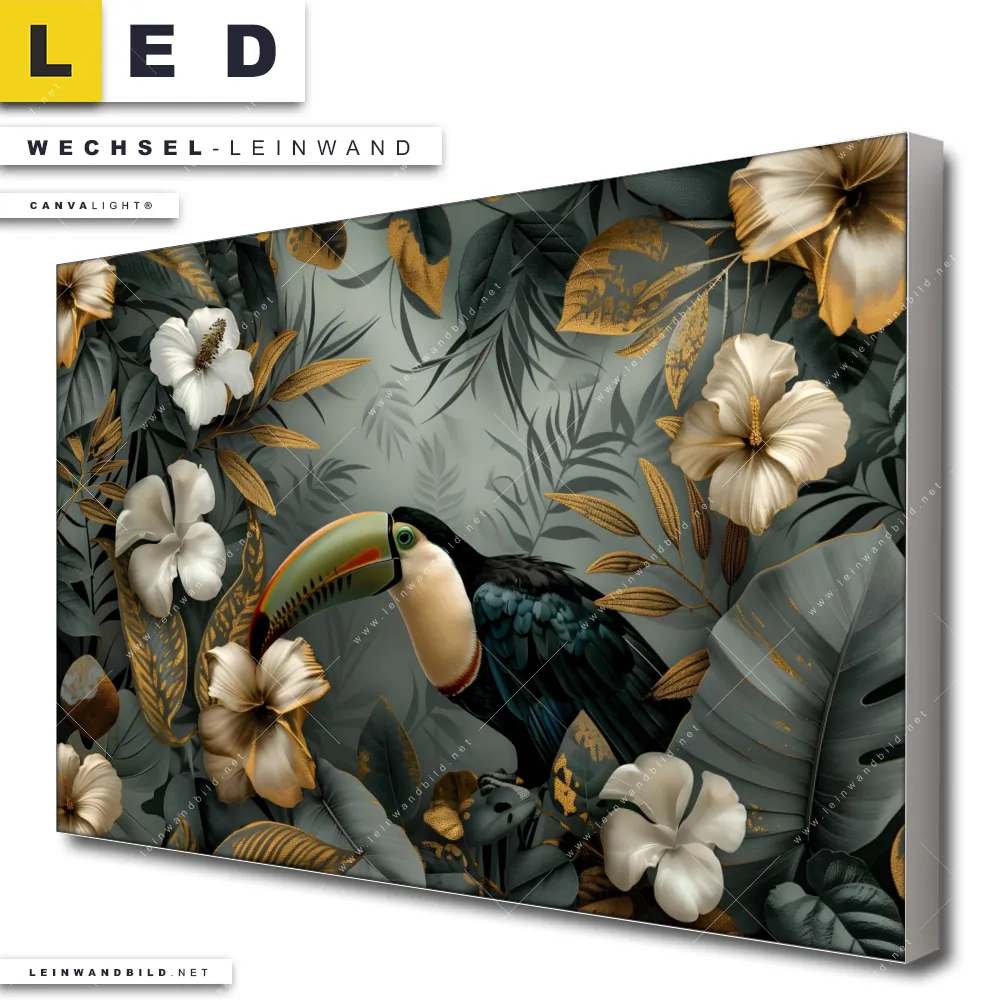 LED Wechsel-Leinwand Canvalight® TEX | Tukan im goldenen Regenwald | Querformat
