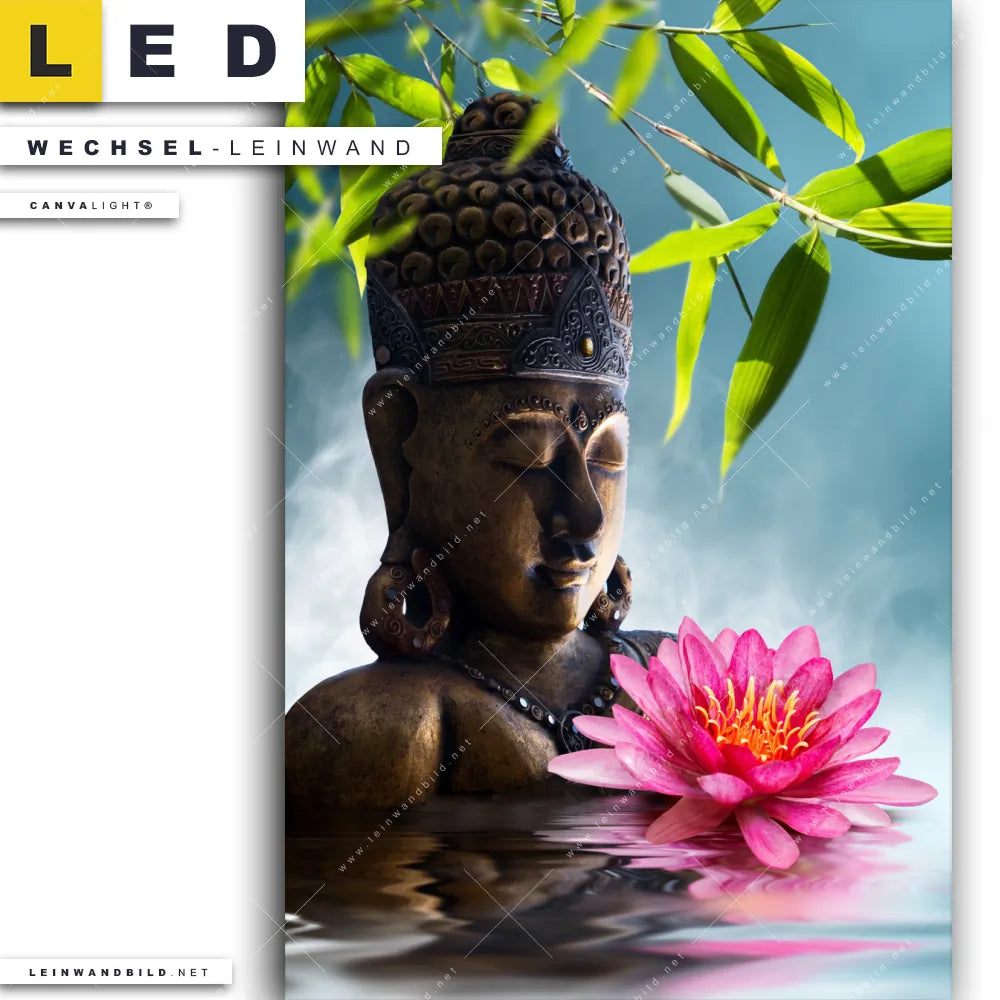 LED Wechsel-Leinwand Canvalight® TEX | Buddha Statue mit Seerose | Hochformat