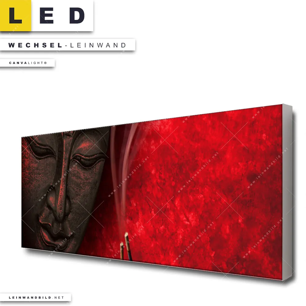 Du bist auf der Suche nach einer Buddha - Feng Shui Wechsel-Leinwand für Dein LED-Leinwandbild im Panorama-Format? Begriffe wie Buddha, Buddhismus, Religion, Feng Shui, Zen, Meditation, Weihrauch haben Dich auf der Suche nach Deiner Ersatz-Leinwand für dein extra breites LED Wandbild mit wechselbarer Leinwand inspiriert? Farben wie Rot, Schwarz dürfen auf Deinem neuen Wechselmotiv für Dein XXL Leinwand-LED-Bild nicht fehlen und Leinwände im Mixed Media, Modern Art Stil für Leuchtbilder passen perfekt zu Deinem Einrichtungsstil?