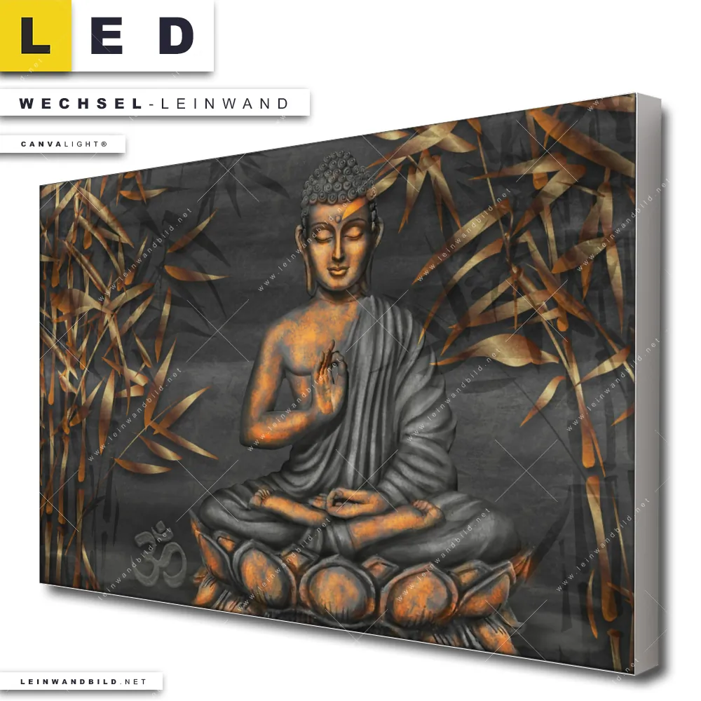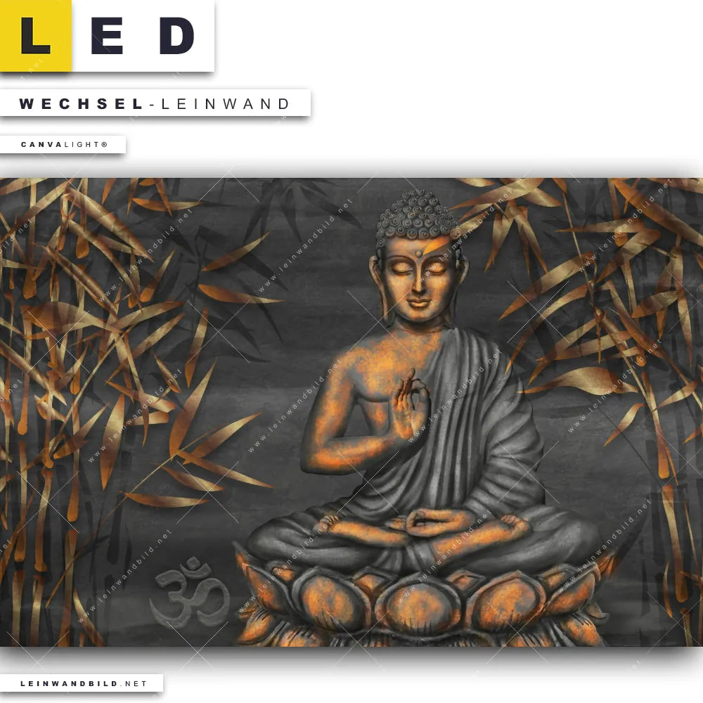 LED Wechsel-Leinwand Canvalight® TEX | Goldener Buddha & Bambus | Querformat