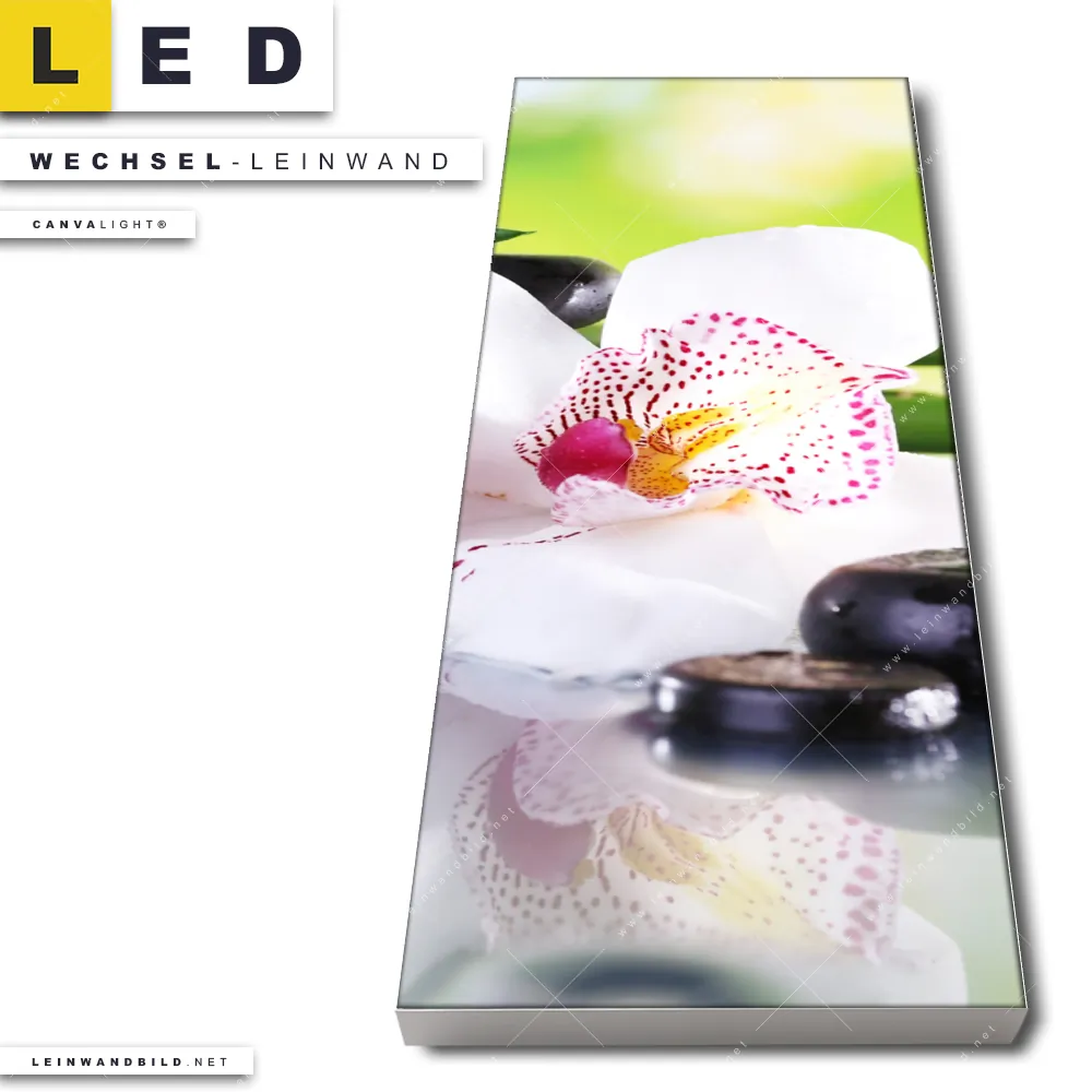 Dann sollte die Wechsel-Leinwand Canvalight® TEX | Spa Wellness Steine | Schmal den Weg zu Dir finden. Die Austausch-Leinwand Orchideenruhe - passend für unsere stufenlos dimmbaren, steckerfertigen Leinwandbilder im LED Leuchtrahmen mit Fernbedienung und optionaler Farbtemperatursteuerung - fügt sich als Eye-Catcher harmonisch in jedes Arzt - Praxis, Büro - Kanzlei, Flur - Eingangsbereich, Wohnzimmer - Schlafzimmer, Friseur - Beauty Raumkonzept ein.