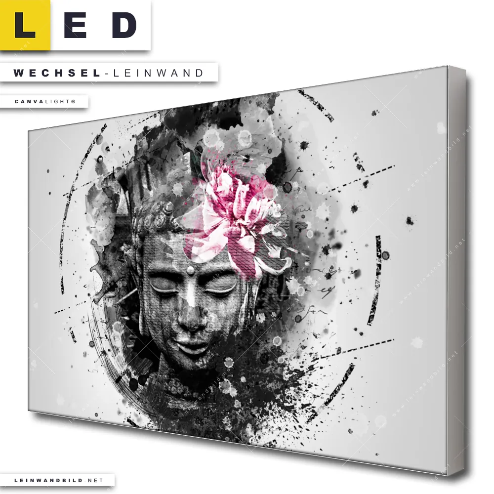 Du bist auf der Suche nach einer Buddha - Feng Shui, Blumen - Botanik Wechsel-Leinwand für Dein LED-Leinwandbild im Querformat? Begriffe wie Grunge, Streetart, modern, Porträt, Gesicht, Buddha, Meditation, Blüte, Blume haben Dich auf der Suche nach Deiner Ersatz-Leinwand für dein breites LED Wandbild mit wechselbarer Leinwand inspiriert? Farben wie Weiss, Schwarz, Pink, Grau dürfen auf Deinem neuen Wechselmotiv für Dein XXL Leinwand-LED-Bild nicht fehlen und Leinwände im Grunge, Mixed Media, Modern Art, Schwarz - Weiss, Street Art Stil für Leuchtbilder passen perfekt zu Deinem Einrichtungsstil?