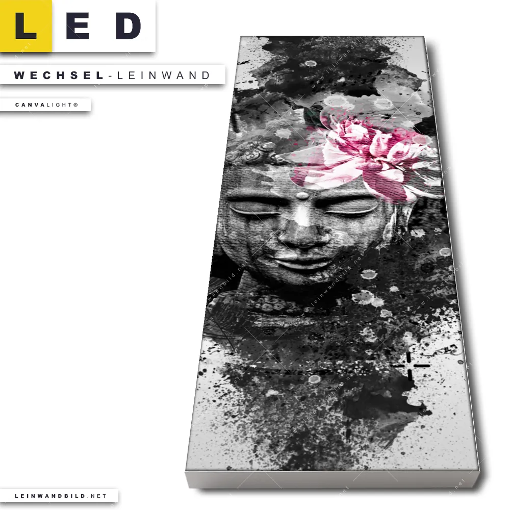 Du bist auf der Suche nach einer Buddha - Feng Shui, Blumen - Botanik Wechsel-Leinwand für Dein LED-Leinwandbild im Schmalen Format? Begriffe wie Grunge, Streetart, modern, Porträt, Gesicht, Buddha, Meditation, Blüte, Blume haben Dich auf der Suche nach Deiner Ersatz-Leinwand für dein LED Wandbild im Panorama-Hochformat mit wechselbarer Leinwand inspiriert? Farben wie Weiss, Schwarz, Pink, Grau dürfen auf Deinem neuen Wechselmotiv für Dein XXL Leinwand-LED-Bild nicht fehlen und Leinwände im Grunge, Mixed Media, Modern Art, Schwarz - Weiss, Street Art Stil für Leuchtbilder passen perfekt zu Deinem Einrichtungsstil?