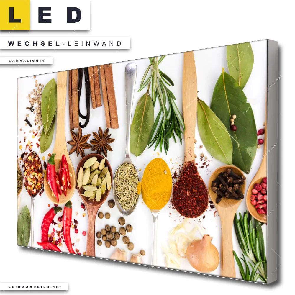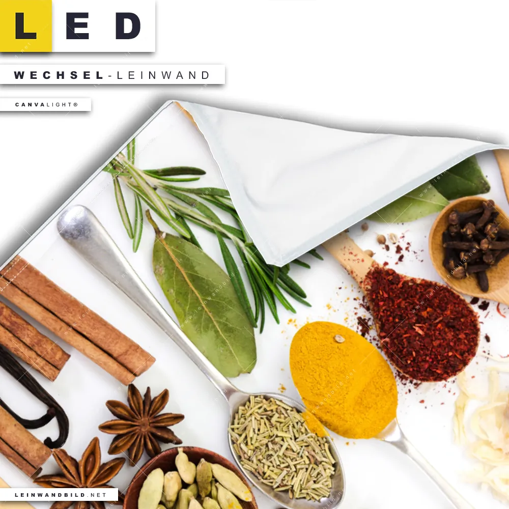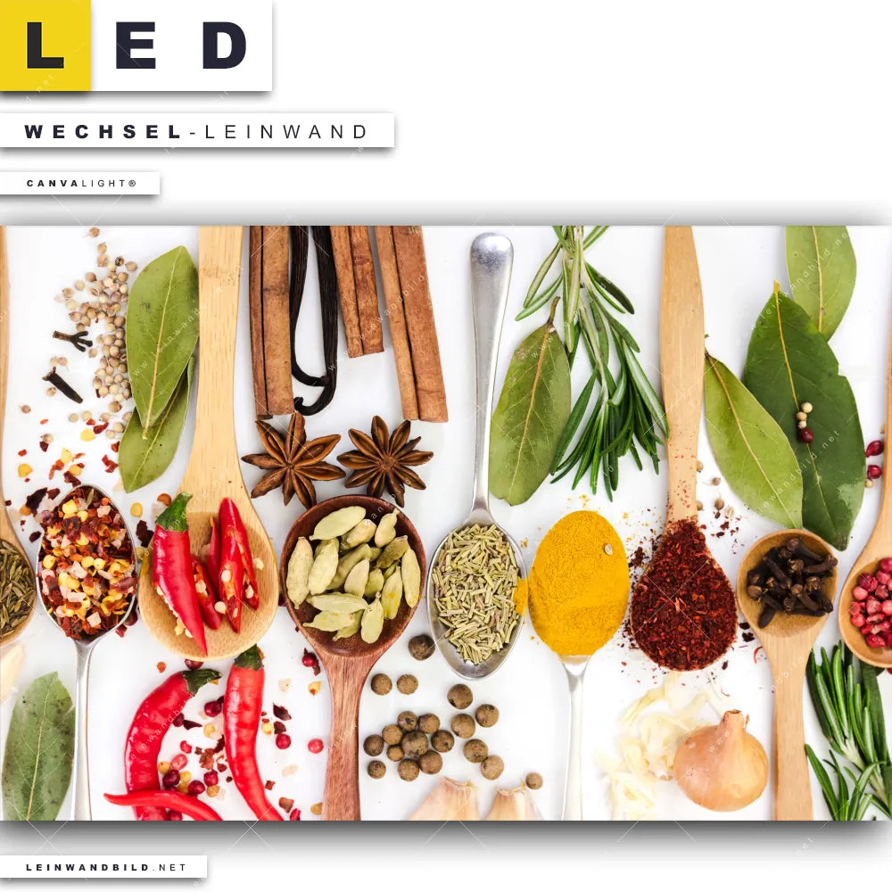 Du bist auf der Suche nach einer Essen - Trinken Wechsel-Leinwand für Dein LED-Leinwandbild im Querformat? Begriffe wie Gewürze, Kräuter, Löffel, kochen, Pfeffer, Salz, Curry, Chili haben Dich auf der Suche nach Deiner Ersatz-Leinwand für dein breites LED Wandbild mit wechselbarer Leinwand inspiriert? Farben wie Bunt, Schwarz dürfen auf Deinem neuen Wechselmotiv für Dein XXL Leinwand-LED-Bild nicht fehlen und Leinwände im Modern Art, Natürlich - Realistisch Stil für Leuchtbilder passen perfekt zu Deinem Einrichtungsstil?