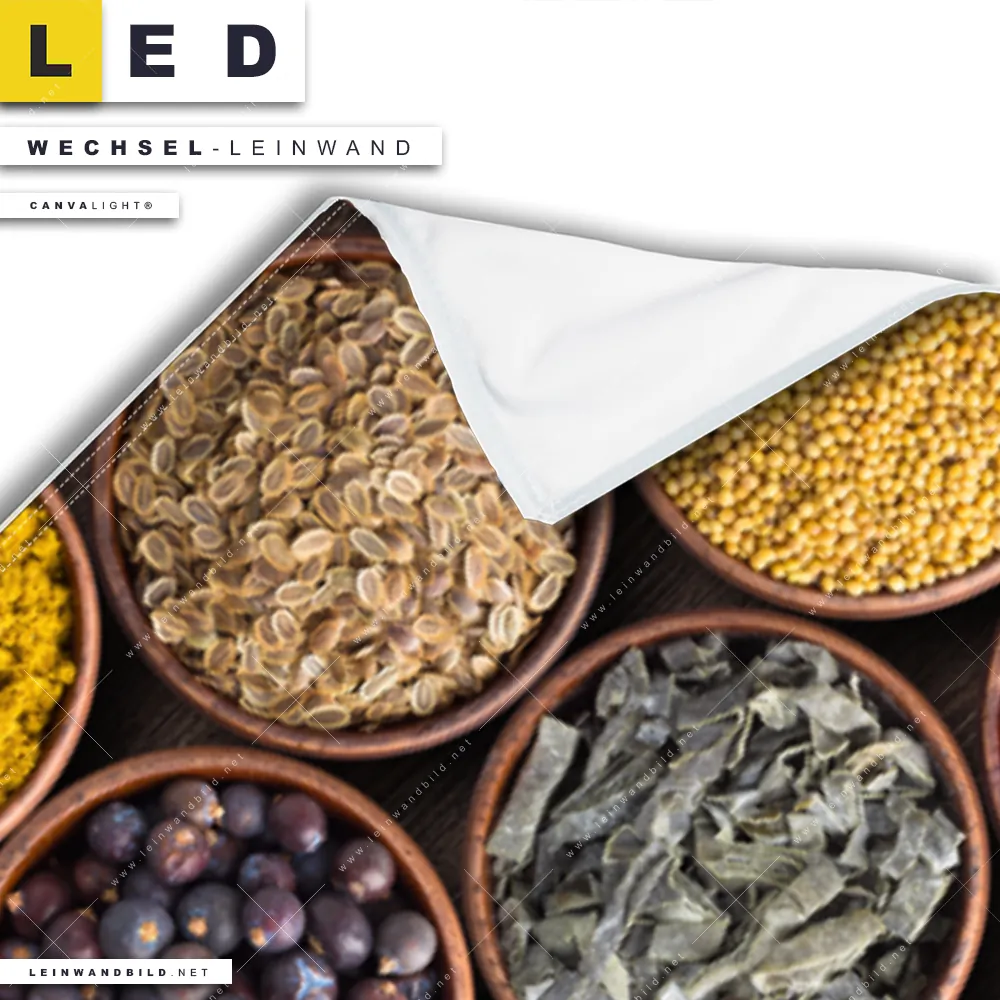 Bitte beachte, dass die Farben, der auf dem Monitor abgebildeten Schälchen mit bunten Kräutern & Gewürzen Darstellung, möglicherweise von den Originalfarben deiner Canvalight® TEX Wechsel-Leinwand abweichen können.