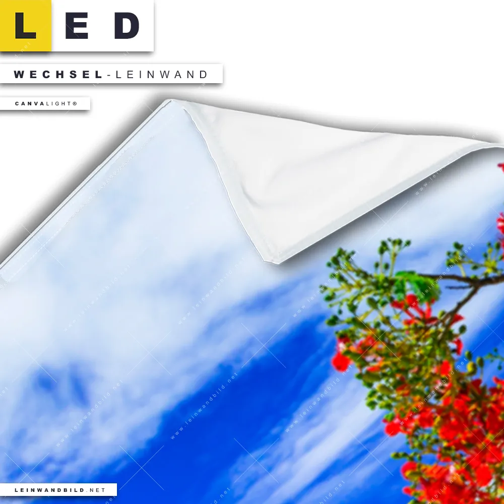 Du konfigurierst Deine individuelle LED Wechsel-Leinwand Canvalight® TEX | Rote Blüten und Türkisfarbenes Meer | Schmal und wir produzieren sie NEU für Dich. Unsere Landschaften, Strand - Meer Austausch-Fotoleinwände für Canvalight® LED Bilder sind KEINE Lagerware. Du bist Dir unsicher, welches Motiv oder Format das richtige für dein individuelles LED Wechselmotiv auf Leinwand ist, dann helfen wir dir gerne weiter und beraten dich!