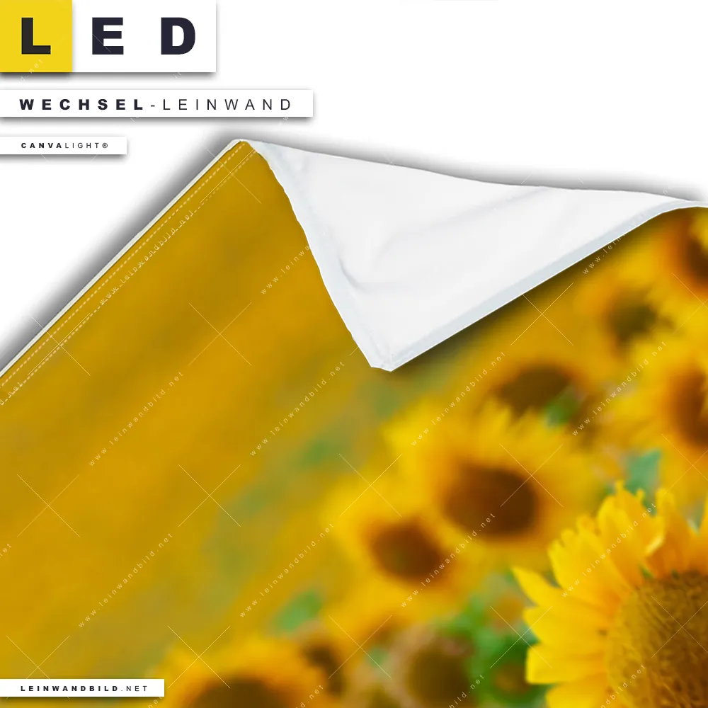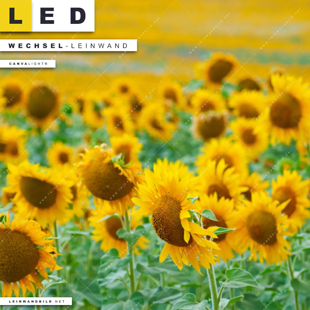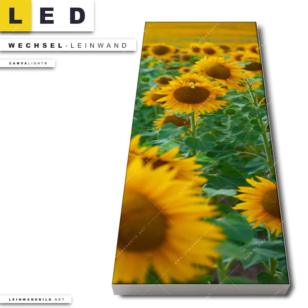 Du konfigurierst Deine individuelle LED Wechsel-Leinwand Canvalight® TEX | Sonnenblumenfeld | Schmal und wir produzieren sie NEU für Dich. Unsere Landschaften, Blumen - Botanik Austausch-Fotoleinwände für Canvalight® LED Bilder sind KEINE Lagerware. Du bist Dir unsicher, welches Motiv oder Format das richtige für dein individuelles LED Wechselmotiv auf Leinwand ist, dann helfen wir dir gerne weiter und beraten dich!