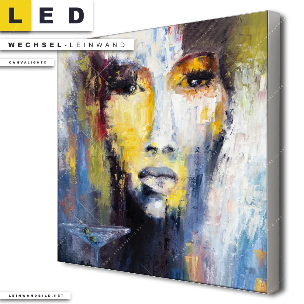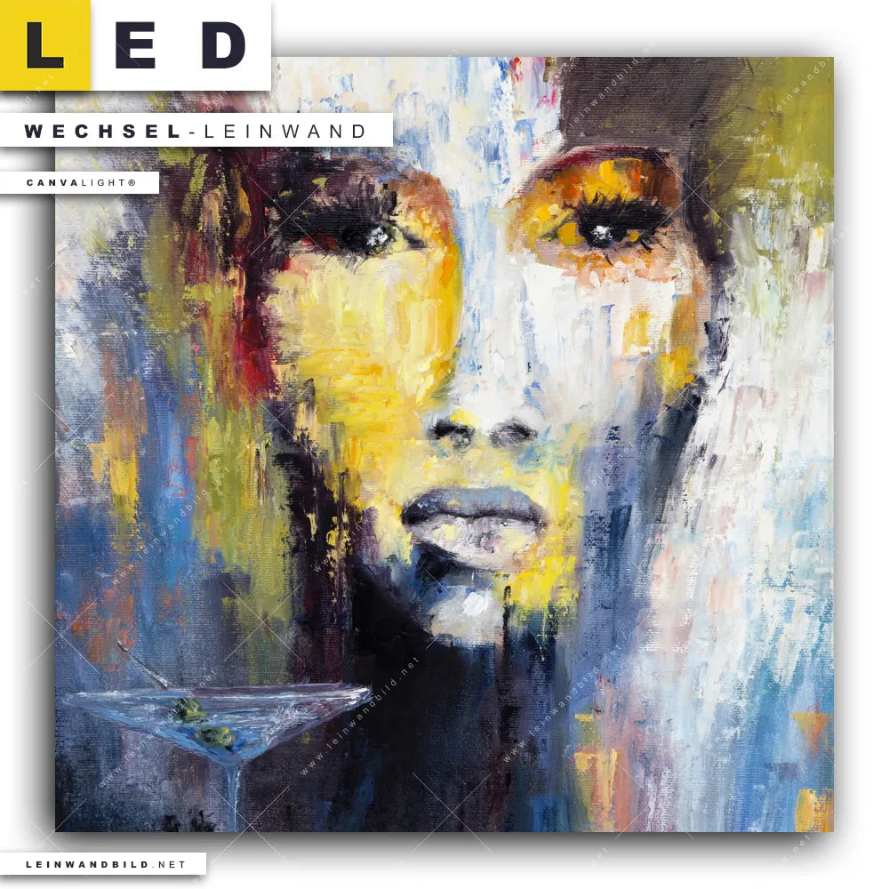 Du bist auf der Suche nach einer Porträts - Menschen Wechsel-Leinwand für Dein LED-Leinwandbild im Quadratischen Format? Begriffe wie Abstrakt, Modern, Kunst, Gemälde, Ölfarbe, Leinwand, Frau, Portrait, Martini, Cocktail haben Dich auf der Suche nach Deiner Ersatz-Leinwand für dein LED Wandbild mit wechselbarer Leinwand inspiriert? Farben wie Blau, Weiss, Gelb , Rot, Schwarz dürfen auf Deinem neuen Wechselmotiv für Dein XXL Leinwand-LED-Bild nicht fehlen und Leinwände im Abstrakt, Modern Art Stil für Leuchtbilder passen perfekt zu Deinem Einrichtungsstil?