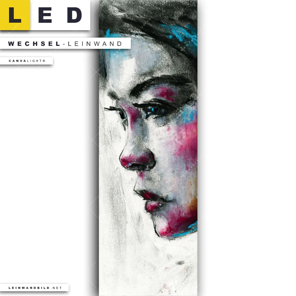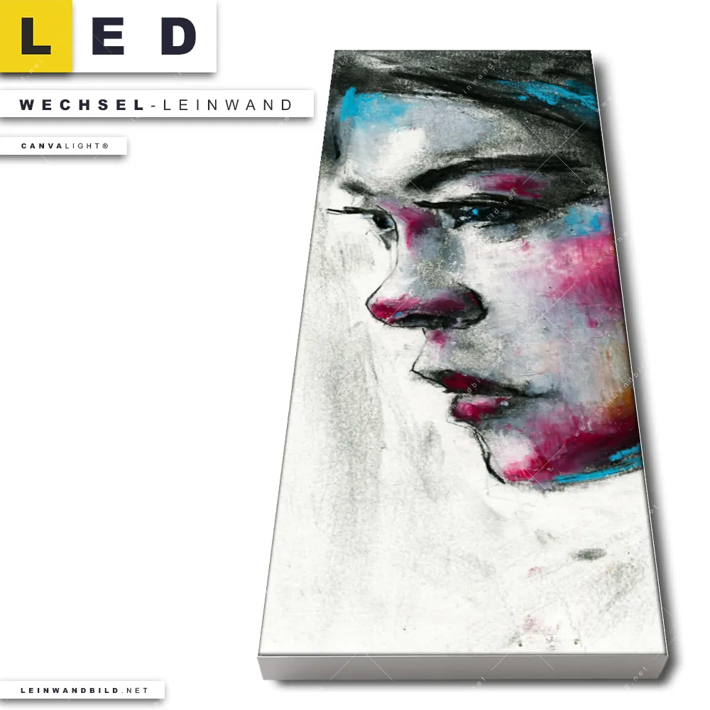 Dann sollte die Wechsel-Leinwand Canvalight® TEX | Schönes Mädchen | Schmal den Weg zu Dir finden. Die Austausch-Leinwand Frauengesicht mit Farbakzenten - passend für unsere stufenlos dimmbaren, steckerfertigen Leinwandbilder im LED Leuchtrahmen mit Fernbedienung und optionaler Farbtemperatursteuerung - fügt sich als Eye-Catcher harmonisch in jedes Wohnzimmer - Schlafzimmer, Bar - Gastronomie, Friseur - Beauty Raumkonzept ein.