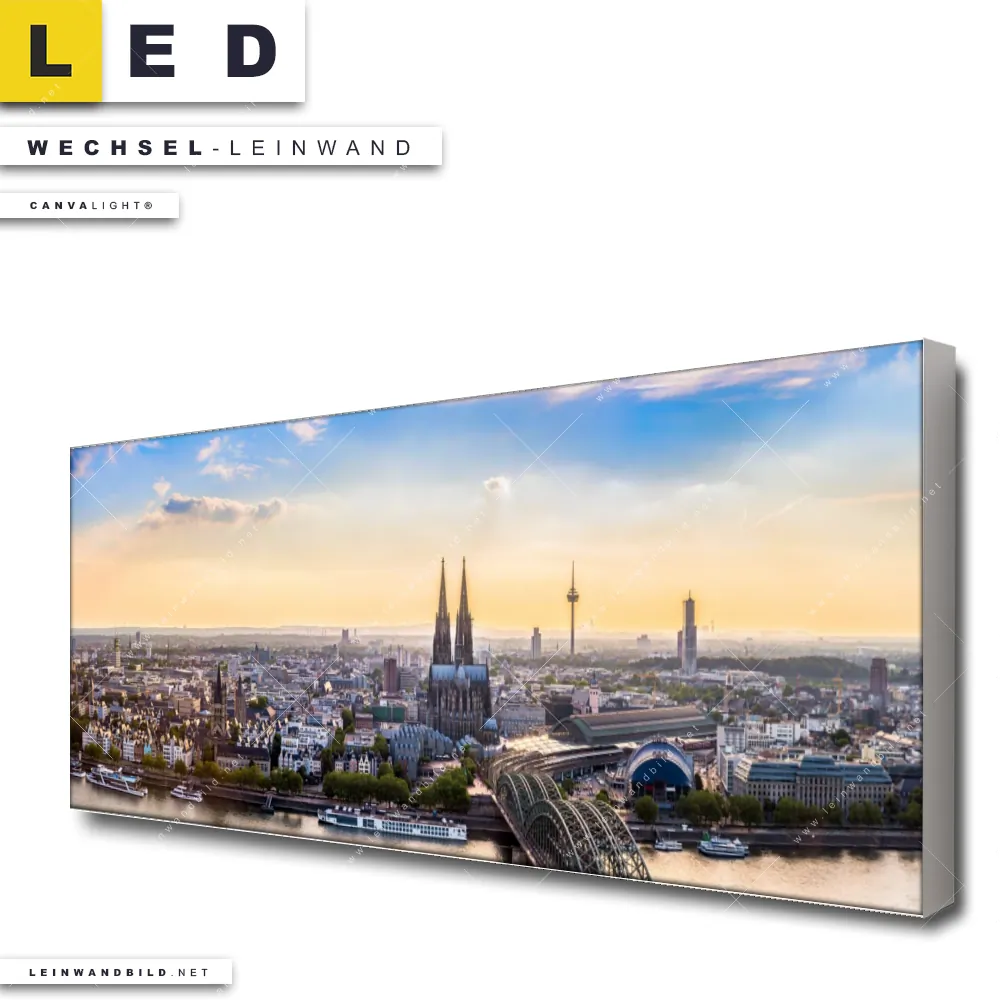 Dann sollte die Wechsel-Leinwand Canvalight® TEX | Kölner Skyline | Panorama den Weg zu Dir finden. Die Austausch-Leinwand Stadtansicht von Köln - passend für unsere stufenlos dimmbaren, steckerfertigen Leinwandbilder im LED Leuchtrahmen mit Fernbedienung und optionaler Farbtemperatursteuerung - fügt sich als Eye-Catcher harmonisch in jedes Büro - Kanzlei, Arzt - Praxis, Bar - Gastronomie Raumkonzept ein.