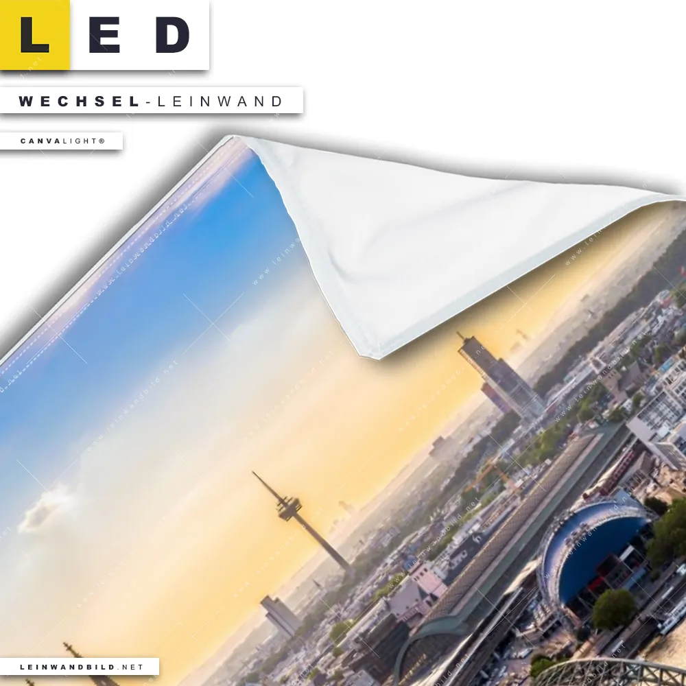 Dann sollte die Wechsel-Leinwand Canvalight® TEX | Kölner Skyline | Querformat den Weg zu Dir finden. Die Austausch-Leinwand Panorama von Köln - passend für unsere stufenlos dimmbaren, steckerfertigen Leinwandbilder im Leuchtrahmen mit Fernbedienung und optionaler Farbtemperatursteuerung - fügt sich als Eye-Catcher harmonisch in jedes Büro - Kanzlei, Arzt - Praxis, Bar - Gastronomie Raumkonzept ein.