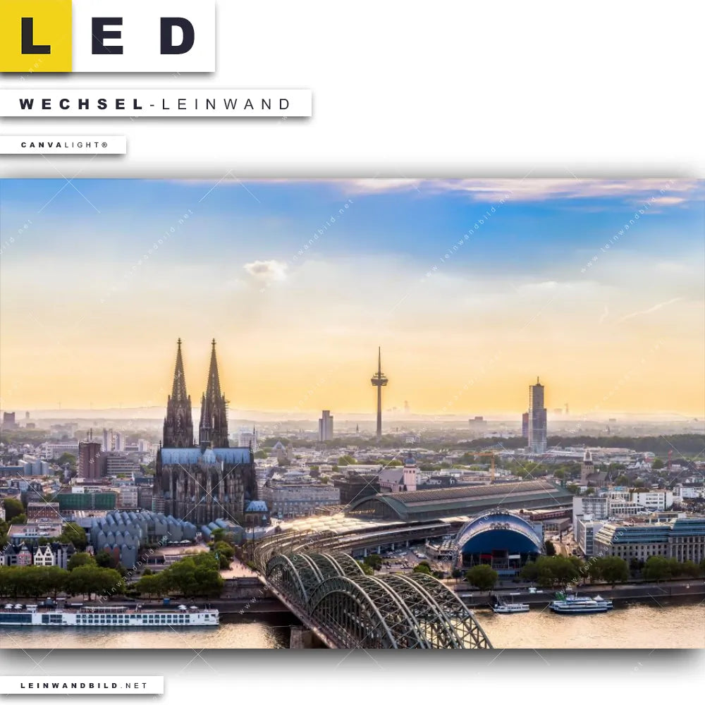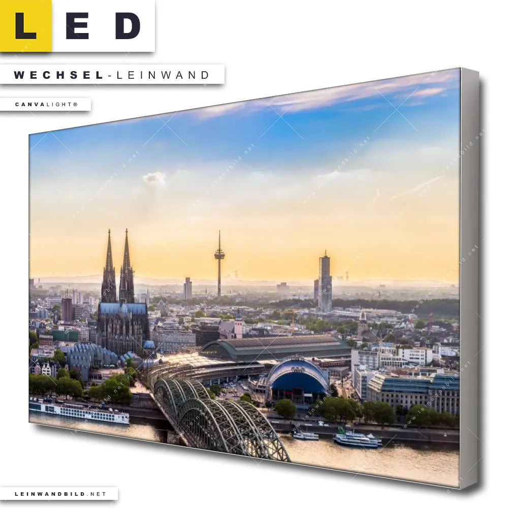 Du bist auf der Suche nach einer Städte - Skylines Wechsel-Leinwand für Dein LED-Leinwandbild im Querformat? Begriffe wie Sehenswürdigkeiten, Skyline, Häuser, Köln, Deutschland, Rhein, Kölner Dom haben Dich auf der Suche nach Deiner Ersatz-Leinwand für dein breites LED Wandbild mit wechselbarer Leinwand inspiriert? Farben wie Blau, Beige dürfen auf Deinem neuen Wechselmotiv für Dein XXL Leinwand-LED-Bild nicht fehlen und Leinwände im Natürlich - Realistisch Stil für Leuchtbilder passen perfekt zu Deinem Einrichtungsstil?